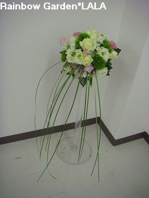 こんばんは^^台風が通過していますね・・20時現在の熊本は風は落ち着いているけど、夕方は結構強かったです。安全対策のため、水耕栽培のゴーヤの支柱(突っ張り棒)をはずして、横に寝せています。マンションの上の方は、本当に予測できないほどの風が吹くことがあり怖いのです。先日、下の階の方が訪ねてきて、「洗濯のポールが下に落ちたのですが、車にあたっていませんか」と・・ポールが頭に直撃したら、きっと・・・。念には念を・・ということで私も気をつけなければと思いました(^-^) 台風といえばですね~気圧の変化を感じる方、いらっしゃいませんか??私は子供のころは全然平気だったのに、近づいてくると体調が・・肩は張るし、頭痛も時々。今回はそんなに影響なかったけど、昨年のはひどかったです。気圧に影響受ける人って、超高層のタワーマンションの上にはきっとなじめないのでは・・なんて想像しています。 だって、エレベーターで数分で小さな山に登るようなものですよね・・今、熊本では、熊本駅前に35階建てのタワーマンションが建設中です。その高さは123m。熊本では最高の高さのものです。着々と出来ていて、今3分の1くらいかな?出来上がるのが楽しみです。東京は、すごいですよね。タワーマンションだらけです今建設中の東京スカイツリーなんて、今現在400mを超えていますものね。ひゃぁ~もう驚きです。人間はどんなものでも作れるのですね(笑) ちなみに、なぜ気圧で体調の変化があるかというと標高が上がると、空気の量が若干減り気圧はさがりますよね。1気圧は、およそ1013ヘクトパスカルとして・・100m標高が上がるにつれ、およそ1%(10ヘクトパスカル)下がります。外から押される圧力が減るから、体は外に向かって膨らもうとするので体調不良が起こるのですよね。むくんだりもしやすいし・・早く安定してもらいたいものです。 さて、先日はお花の教室でした。テーマは、先生いわく「魅惑のグリーン!」素敵な題目です(^-^)好きなように自由にどうぞ・・と言われたのでアジアン系にアレンジしました。私の中では、バリのリゾートのイメージです。石でできたカエルの横に飾ってあるような・・(笑)ウコンのお花に似ている真中のピンクのお花は、クルクマといいます。なんだかお釈迦さまが生まれてきそうな雰囲気で綺麗です。対角線上にモンステラの葉を飾ってみました。スワロフスキーの蝶で飾り付けして遊んでいます緑だけのアレンジ、夏の今にぴったりで気に入りました! ちなみに、主人のお母さんの作品はこちらヘデラをまぁるく囲って創造性にあふれていますね豪華な雰囲気です。もう一人の生徒さんのものです結婚式にもあいそうな可憐な雰囲気です作る人によって、個性が表れますね。自由に作らせてくれるので、とても楽しいです前回のアレンジはこちら「高原からの涼やかな便り」という題でした。白と黄色と紫、高原にぴったりの涼しげなアレンジです。夏は細い葉が良いですね。真中の紫の花は、トルコキキョウです。このアレンジは、祖母のお見舞いにもっていきました。病室に飾ると、部屋全体が華やかに明るくなりますね。花の存在感の偉大さに改めて驚きました 水耕栽培、そろそろゴーヤも終わりかけだし・・次は何を育てようかな?葉物がいいかなぁ??にほんブログ村へは、こちらから・・水耕栽培されている方の日記が紹介されています。・・・・・・・・・・・・・・・ごきげん野菜さんのモニター中です。水耕栽培はこちらから
