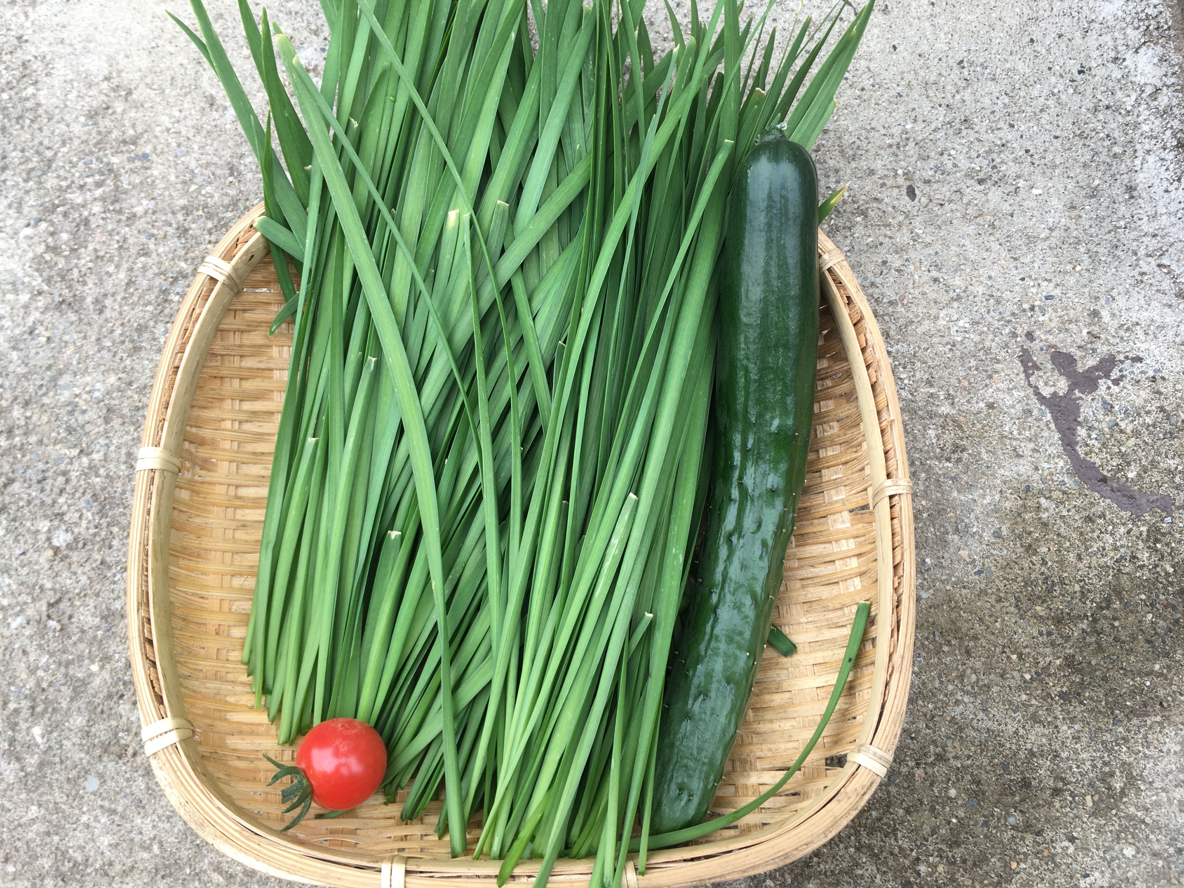 ニラ・キュウリ・ミニトマトを収穫ミニトマトは1個だけ1苗だけので同時に何個も収穫できない来年はもっと本数増やそうかなポッチとね