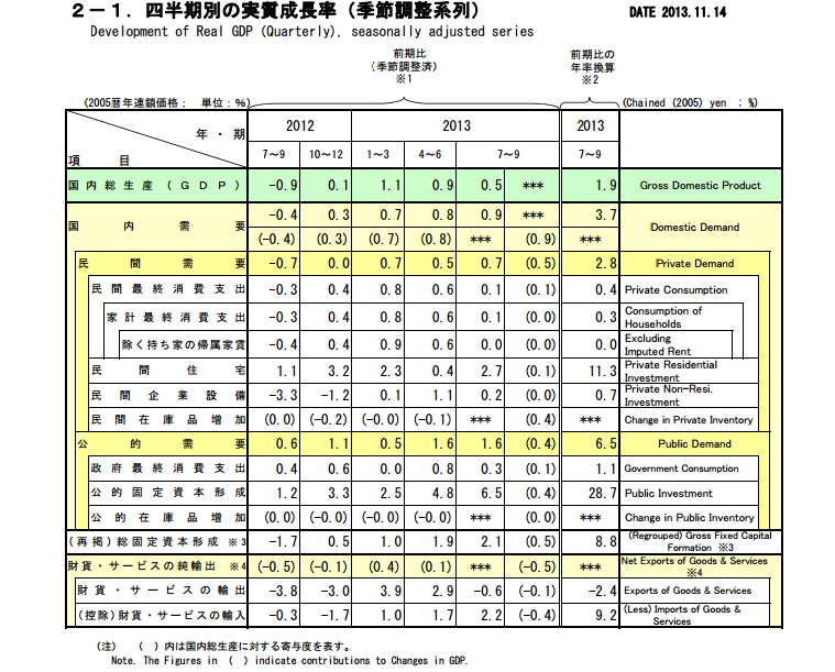 2013年度第2四半期(7-9月)期GDPの成長は前期に比較して伸び率が半減した。金融緩和効果(株高・円安)が一段落し、消費が微増となり、輸出は新興国の景気減速を受けて減少となり、公共投資、在庫投資の下支えはあったものの、息切れ状態であった。10-12期には、経団連の報告にもあるように冬のボーナスも増加が見込まれ、来年の消費増税前の駆け込み需要が見込まれる。 EU圏の経済は、ユーロ高の懸念材料はあるものの、4-6月期0.3%、7-9月期0.2%と 、独、仏の鈍化があっても、プラスを維持している。 今後の景気の行方は、一時的な支払いの賞与のみでなく、毎月給与の増額があることが必要である。企業は、輸出が本格的に回復するかどうか、消費が安定して増加するかを注視している。 11月に入って発表された企業の中間決算の好成績、 経団連の「賃上げ明文化」などは明るい材料ではある。実質GDP成長率(季節調整済み前期比)の動き<2013年7-9月期>項目実質成長率、()は4-6月期説明(内閣府、読売新聞等)GDP +0.5%(+0.9%) 内需寄与度 +0.9% (+0.8%)国内需要 外需寄与度 ▲0.5%(+0.1%) [輸出-輸入] 民間最終消費支出 +0.1%(+0.6%) 自動車、旅客輸送、身の回り品が増加に寄与 株高で消費に廻るお金が増える「資産効果」の弱体化、株式等売買手数料の減少今後10-12月期には消費税増税前の駆け込み、住宅購入に伴う家電・家具などの消費が盛り上がる見込み。一部高級品は好調だが、低価格をアピールしないと客足を惹き付けがたいなど、消費の力強さ不足。 民間住宅投資 +2.7%(+0.4%) 6四半期連続増加。新設住宅着工戸数は全国的増加。 民間企業設備 +0.2%(+1.1%) 3四半期連続増加。火力発電所設備更新、自動車等輸送機械などの設備投資が寄与。 民間在庫品増加 +0.4%(▲0.1%) 自動車など製品在庫増加、流通在庫はマイナス寄与。原材料・仕掛品も増加寄与。 政府最終消費支出 +0.3%(+0.8%) 14四半期連続増加。医療費・介護費(現物社会給付)の傾向的増加。 公的資本形成 +6.5%(+4.8%) 7四半期連続増加。公共工事請負金額が全国的に増加。12年度補正予算の公共工事の本格化 公的在庫品増加 +0.0%(▲0.0%) 財貨・サービスの輸出▲0.6%(+2.9%) 3四半期ぶりの減少。電子・通信機器、石油製品、鉄鋼製品など減少。ASEAN諸国連合などの景気減速企業の海外工場移転で、円安の恩恵を受けにくくなっている 財貨・サービスの輸入 +2.2%(+1.7%) 3四半期連続の増加。輸送機械、電子・通信機器などが増加。 (雇用者報酬)▲0.6%(+0.3%) 家計最終消費支出デフレーターが上昇したため実質値は季節調整済み前期比▲0.6%、前年同期比▲0.2%と、ともにマイナス。名目雇用者報酬は、一人当たり賃金(現金給与総額)は減少したが、雇用者数は増加して、総額ではプラスとなった。名目値は季節調整済み前期比見ると▲0.2%と3四半期ぶりのマナスながら、前年同期比で見ると0.5%と、2四半期連続プラスである。「賃金率」の動向は、今後の消費意欲の盛り上がりを左右するだけに、景気の方向に影響を与えそうだ 参考資料:資料出所=内閣府経済社会総合研究所 国民経済計算部