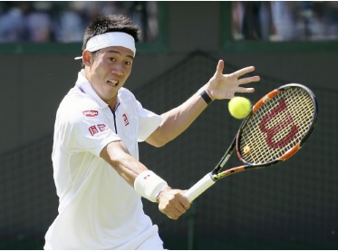 ★ 小生は、脳幹梗塞を患い、トレーニング機械を使ってのリハビリで腕、足、体幹などの筋肉を付ける工夫をしている。・・・ 神尾米さんの「現代テニス」の今回は、「サーブ編」であり、小生が一番弱い肩や足や体幹全ての筋肉を駆使しなければ達成できないレッスンである。★ とりあえず、小生のGRIPは、コンチネンタルグリップ(少し厚めに)である。 グリップエンドが隠れるほどに握った方が、グリップ回転が利きやすい。 人差し指と中指に隙間を作ることが持久力には役に立つ。 サーブを大別すると; 無回転・高速の「フラットサーブ」、 斜め逆回転・左に滑る「スライスサーブ」、 強力な順回転・右に高く跳ね上がる「スピンサーブ」に分類される。 それらの練習の時のトスは、 フラットサーブは(12時ー)1時の方向、 スライスサーブは(1時ー)2時の方向、 スピンサーブは10時の方向に上げる (試合の時はどこにトスするかで 相手に見破られないように工夫すべきであるが)。 顔の前からトスを上げるときは、左手は上に上げたままであるが、伸び上がるのではなく、身体は膝をゆるめて重心を下げる。 其処から伸び上がって球を打ちにいく。 (コーチは「生卵」をボールと見なして投げ上げる練習をしたという。)★ フラットサーブでは回転を掛けずにうつ。 (ラケットを背中の後ろに担ぎラケットを垂直に持ち上げながら頭上で面を正面に向けて)振り下ろす。 おへそに向けてラケットを収納する気持ち。 一番意識するのはラケットヘッドの真ん中。 打った方向に足が出るように。 インパクトの瞬間は親指を相手に向けるイメージを取ると、ラケット面が相手と正対する。 ★ スライスサーブは右上から左下への回転がかかり、緩いカーブを描き左に流れる。 ラケットヘッドの少し右側を意識し、そこが先頭になるようにぐっと引きつける気持ちが大事。 フォアサイドにワイドに打つと「エース」、センターに打つと「ボディ」が取れる可能性がある。 ★ スピンサーブは強力な順回転を掛けるため、球の後ろから擦り揚げ、前に撫で下ろす作業を瞬時に行う。少し上体を反らし、落ちてきた球を、左下から右上方に持ち上げ、ラケットを空に放るようなイメージ。 大きな円を描いて、左脇にギュッとラケットを収めるように振り下ろす。★ サーブの場合は、なるべくジャンプしてコートに飛び込む気持ちで。 トスを上げるタイミングで、右足を左足に寄せて揃え、重心を低くし、伸び上がってジャンプし、ボールを打って、コートの中に左足で着地、右足を一歩前に出して、踏み込む。 ★ ダイナミックで強力なサーブをするには、身体の捻りを使い、ラケットをしなやかに動かす。 左手で球をトスして上げていく時は、左手が伸びたままで左肩も上を向いているが、ラケットを担いだ右肩が上がってくると、左肩は下がりラケットが降りてくる。 それを左脇に振り下ろす。 身体の捻りを一気に振りほどく気持ちで。★ 原則、ファーストサーブは強力なフラットサーブ。 セカンドサーブで、サーブが入らないとテニスの試合にならないから、強い回転があり、サービスライン内に安全に舞い降りるスライスやスピンサーブを使う。 決して、ラケットをゆっくり振ってはならない。 ゆっくり振ると、回転が掛かりにくく、スライス、スピンの回転が生まれない。 確実に入れるためには、身体の前に風船があるように意識し、球を自分に近づけて、回転を強く掛ける。 ★ 呆けの小生が写経したものであるから、信用してはならない。 原本テキストをしっかり読んで確認してください。 一番良いのは、録画して何回もご覧になることです。 ★ ・ おっと、昨夜の錦織選手は、片方の足の筋肉を痛めていたこともあり、苦戦が続いた。 結局、3対2で勝利した。第五セットは完璧(本人曰く)であったが、その他では、相手にかなり押されていたようだ。 相手はATPランキングではかなり劣ってはいるが、4大大会のダブルスでは優勝したことがある試合巧者である。 バックハンドには、ひ弱さも見られたが、普通の球を打つと、アングルなどに厳しい球を打ち込まれる。 次第に修正が出来て勝利したが、怪我のために時間が掛かったようである。 次回は、怪我の後遺症もあるから、早めに修正して勝負して貰いたい。★呆けが言っても仕方がないが、チャンコーチはどこに行ったのか見えなかった。誰か、「マイケル・ちゃん」を知らないか? 次回からはぜひ錦織圭コーチ陣に控えて貰いたい。★ <ウインブルドン1回戦突破の錦織:読売新聞三浦邦彦氏撮影>★ <ゲリーウェーバーOPEN準決勝対セッピ戦での錦織圭棄権の直前> ウインブルドンではびっこを引いては居ないので、痛みはないようであるが、意図して隠しているようにも感じる。 隠せる様なくらいなら、それほど酷くはないかも知れない。 マイケルチャン・コーチも「ちゃんと」助けてやって欲しいものである。 ★