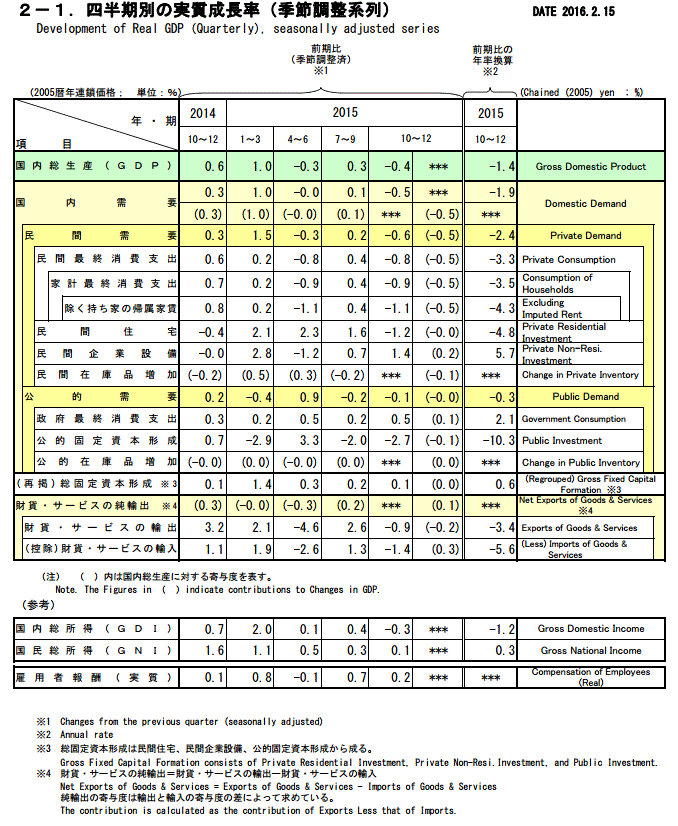 ★本日8時50分に内閣府から国民所得統計の2015年度第3四半期のGDP一次速報値がWebで公表された。本日は、朝日新聞の休刊日でもある。NHKのTVテロップには出ているが大事な情報であり、速記する。★ 四半期ベース実質GDP(2-1表)成長率を2014年度第3四半期~2015年度第3四半期まで見ると、0.6%→1.0%→▲0.3%→0.3%→▲0.4% と成長率の一進一退がみられる。GDP構成項目の成長率で見ると、6割を占める項目の民間最終消費支出が▲0.8%、民間住宅▲1.2%、公的需要▲0.1%と成長率を下方に引っ張っている。原油の価格低下により大幅に縮小している輸入(▲1.4%)にも拘わらず、輸出は円安という好環境にあるが、中国(☆)だけでなく、世界経済の悪化を受けて▲0.9%と減退している(→純輸出はわずかに+0.1%増加)。ただひとつ民間企業設備は+1.4%とあるが、先行き景気指数の機械受注(*)は中国経済などの不況を受けておりこれも不安材料が大きい。(☆:中国については、同国の経済成長率の低下による日本からの輸出の 翳りがあり、同国の輸出ドライブの影響で日本の鉄鋼などの輸入急増もある。 また、同国からの観光客の相変わらずの爆買い特需も起こっている。) (*:機械受注の船舶電力を除くの2015年季節調整値実績推移・・・8月=▲ 5.7%9月= 7.5%10月= 10.7%11月=▲14.4%) ★暦年実質値(3-1表)で見ると、個人消費▲1.2%、民間住宅投資▲2.6%などのマイナス成長を、民間設備投資1.3%、公的需要0.4%(但し資本形成は▲2.2%)が辛うじてカバーし、財貨サービスの純輸出がプラス0.4%だけ頭出ししている格好である。★暦年名目GDPでは2.5%の成長率で、GNIも3.0%の成長率であるが、雇用者報酬は1.5%の成長に過ぎない。GDPデフレーターは2.0%の上昇となっている。政府のインフレ目標は2%だから物価は上がっているのかもしれない。しかし、雇用者への分配が適正に図られているとは思われず、企業の内部留保の確保に向かっているように見える。今後は、企業設備投資を進めること、または、労働者への分配を高めて個人消費支出の増加を図るような方向転換が必要であろう。 いまのままだと、アベノミクスを守るあまりに年金=GPIFの半分を株式市場に投機的機会として無理矢理に投資させているのが目立つ。株の安定化を図り、景気を煽っていても、設備意欲は沸かず、儲けだけを狙う人の多い、株式市況は低迷する危険があろう。 マイナス金利政策も、将来の悪い見通ししか持たないように思われ、振込手数料の割高など国民生活にしわ寄せが来そうである。貯蓄に回すのでなく、国民が健康的な生活にもっとお金を使うような生活様式を政府は構築すべきである。★ ・ ★参考:内閣府国民所得部本日公表資料から ★ボケ頭の速記であり、現物をご覧ください。★