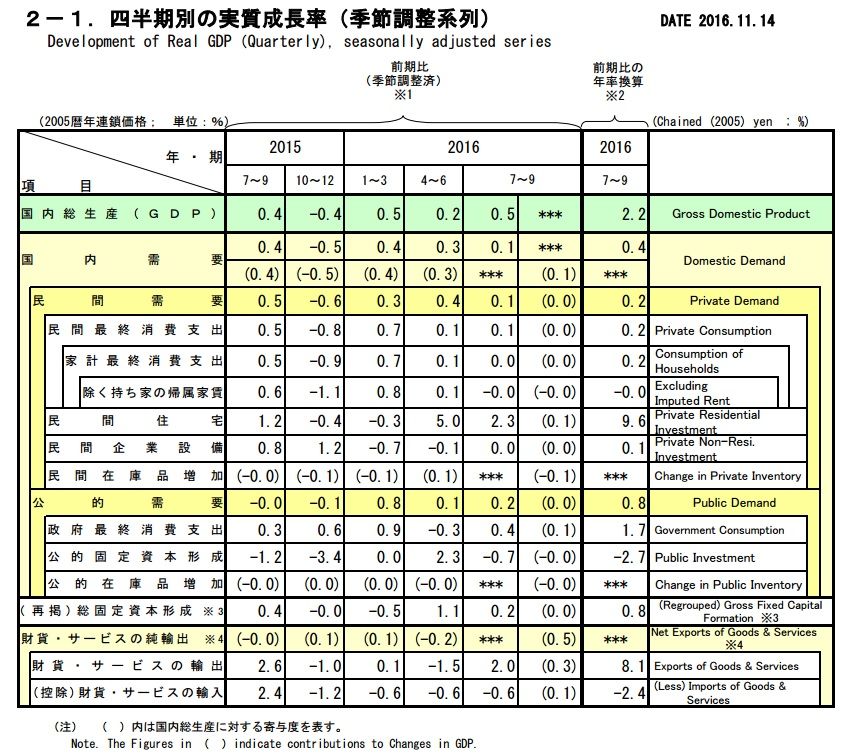 ★ 2016年7~9月期GDP1次速報(=QE)が 本日14日早朝に内閣府経済社会総合研究所 国民経済計算部から発表された。 そのままの図表を掲載する。1.「本年度第2四半期(=2nd Q)7~9月期」の実質GDPの伸びは 季節調整済みの伸び率でみて 昨年同期から 0.4%→▲0.4%→0.5%→0.2%→0.5%と、 「昨年度3rd Q」にマイナスとなった後はプラスで推移している。 内・外需の寄与度で見ると、 「内需寄与度」は0.4%→▲0.5%→0.4%→0.3%→0.1%、 「外需寄与度」は▲0.0%→0.1%→0.1%→▲0.2%→0.4% 2.項目別に見ると、 「昨年度3rd Q(=10~12月期)」にプラスであったのは 民間企業設備投資Ip 1.2%と、 公的最終消費支出Cg 0.6%、 純輸出 0.1%のみであり、 その他のGDP項目は全てマイナス (個人消費▲0.8%、民間住宅投資▲0.4%、公的需要▲0.1%)であった。 その後は、GDPの6割を占める民間個人消費支出Cpは0.7%と 一時はプラスに転じたが、0.1%が2四半期続くなど僅かの力しか 示さなかった。 民間企業設備投資は前年度4th Qには▲0.7%のマイナスとなり、 本年度1st Qには▲0.1%、2nd Qには0.0%と横ばいである。 民間住宅投資は、日銀のマイナス金利政策で長期金利が低下した ことから昨年度4th Qまでのマイナスから、今年度1st Qには5.0%、 2nd Q 2.3%と回復している。 しかし、GDPの構成項目としては小さく、寄与度は0.1%と小さい。 公的需要(消費+投資)も昨年度4th Q以来、僅かながらプラスを示している。 輸出は、昨年度3rd Q、本年度1st Qにマイナス(▲1.5%)となったが、 今年度2nd Qには 2.0%とプラスに戻している。 輸入は、原油価格の低下などで、昨年度2nd Qの2.4%以降は、 マイナスを続けている。 輸出から輸入を差し引いた「純輸出のGDP成長寄与度」では、 「2015年度2nd Q」からの推移でみると、 ▲0.0%→0.1%→0.1%→▲0.2%→0.5%と 輸入が原油安のなかで引き続き減退し、 輸出は前期の落ち込みのあとに戻している。 GDPの増加の寄与度では、この海外要因が今7~9期には 最大の貢献者となった。3.GDPデフレーター(季節調整済み)は 昨年度2nd Qからの伸びが、0.4%→0.1%→0.2%→▲0.0%→▲0.3% とマイナス化している。 今年度1st Q→2nd Qの伸びは、国内需要デフレーターは▲0.3%→▲0.2%、 同様に輸出デフレーターは▲2.5%→▲2.4%、 輸入デフレーターは▲3.9%→▲1.8%4.新聞報道では、いつものようにプラス面を過大に取り上げている。 国内要因は、マイナス金利政策で活発化した住宅投資が牽引しているが 寄与度は0.1%にしか過ぎない(在庫減で寄与度は相殺されている)。 GDP主要項目の個人消費は弱々しい(寄与度は 0.0%)。 主たるGDP引き上げは何かというと、 外需の寄与が大きいことであろう。 国際的に新興国、産油国での需要の冷え込み、 中国経済の不振から鉄鋼等の輸出ドライブが 世界の輸出環境を悪化させており、「日本の輸出もあまり冴えない」。 「原油安での輸入の落ち込み」が、「純輸出」を好転させている。 決して、楽観できる国際環境ではあり得ず、今後はBREXITの行方、 今まで好調であった米国経済が、今回のトランプ旋風でどのように動くか、 慎重に見極めないといけないだろう。 米国での共和党のバラマキ政策であれば日本経済は好転するが、 米国の保護主義が強まれば日本の直接対米輸出、 メキシコなど経由の間接対米輸出が萎む可能性もあり予断を許さない。 「株価や金利」の儲け話だけが刹那的な新聞種になっていたが、 今後は米国の政策変更を真剣に、深くフォローアップする必要がある。 米国でのマスコミ(・新聞社)等の情報入手能力が問われる時代 である。★ 追加したいのが、韓国のサムソン電子のギャラクシー7の生産中止 (バッテリー爆発事故などによる)で見られるような事態である。 日本製のスマートフォンへの選好が中国などで起きていること ではないだろうか。 日本製品の「安全性」に再び中国などが注目してくれていれば、 今後もスマートフォン向けの電子部品や半導体製造装置などの 輸出が伸びることに繋がるかも知れない。