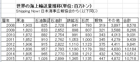 ★ 四方が海に囲まれた東方の日出ずる国の日本は、 島嶼が多いことでも知られる海運国家であった。 世界的に人口が増えて、本来は物資の運搬が増えるのだが、 2008年のリーマンショックを境に、原油輸送に顕著に表れているように 物資の輸送に翳りが見えている。 海上貨物輸送量に比べて、海上輸送船腹の殖え方が大きいように見える。 これでは、海上運賃も下降に向かうであろう。 船種別に見ると、 バラ積乾貨物船(=バルカー)の割合が 約34%、 オイルタンカーが 20%、コンテナ船が 18%、 旅客船・RORO船等 7%、ケミカル船、液化ガス船がそれぞれ 5% などとなっている。 これらの船腹量を所有者(=船主) (船を税務上の利益確保のために便宜上置いている船籍ではなく) で区分すると、アジア以外は約57%で、アジアは43%を占める。 そのアジアの中のシェアをみると日本がトップで31%、 中国が21%、シンガポール、韓国がそれぞれ11%、 香港が10%、台湾が6%である。 /// 世界に目を転じると、1位はギリシャ、2位に日本、3位に中国、 4位に独と続く・・・ /// 造船業は、海洋立国・日本にとって重要な産業であるが、 世界の造船建造シェアを見ても判るように、韓国や中国に取って代わられており、 現在は中国が37%で1位、韓国が35%で2位、日本が19%で3位である。 造船量は2011年に1億総トンをピークに、現在は2008年の水準 6,800万総トンに 戻っている。 ///// 2008年のリーマンショックからの景気の立ち直りを見込んだ 海運会社が大規模な船腹増強を計画した。 しかし、実際には、世界需要の5割を占める中国をはじめとして 新興諸国の景気は振るわず、原油などの物の動きも鈍く、 海運運賃は低迷、下降を続けている。 ///// <第一海運バラ積み貨物船:上はバルチック指数> 1. このような、海運不況から2015.9.29 東京地裁に 日本のバラ積不定期貨物船会社:第一中央汽船(国内売上第5位、商船三井系)が、 民事再生法の適用を申請した。 海運業界の市況悪化に加えて、自社の船腹増強計画が裏目にで、 さらに主たる荷主であった住金が新日鐵と合併(2012年)したことで、 後者の輸送を担っていたNSユナイテッド海運に荷を奪われる形となったことが 被害を大きくした(負債総額1,760億円)。 2. 韓国海運の最大手(世界7位)である韓進海運がこの8月末に倒産した。 呆けの小生でも、町の中をHANJINのマークを付けたコンテナを積んで走る 大型トレーラートラックをよく見かけた物である。 コンテナ船が世界の物流を妨げるような形で立ち往生したのは この企業の倒産による。 韓国最大手の海運企業の倒産と、世界の港に於ける物資の滞留を生じたことに 韓進財閥や兄弟会社・大韓航空(ナッツリターン問題も)への風当たりは強い。 逆に、韓進財閥は国際競争で政府の協力下にあるデンマーク企業(世界1位)との 競争に敗れたためとして韓国政府に支援を求めている。★ ・世界の海運会社の所有・支配船腹のランキング 2016.11.4 Alphaliner-Top 100から 商船三井=MOL 日本郵船=NYK Line 川崎汽船=K Line 韓進海運=Hanjin Shipping★ 後半では、日本のコンテナ船事業の3社の合従連衡の意図を見ていきたい。★