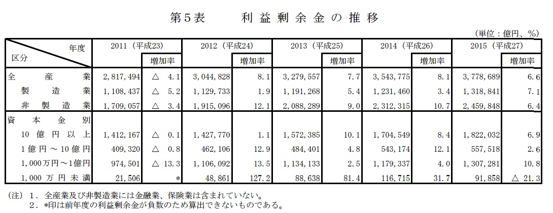 つまり、資本金規模別の合計の全産業(金融保険業を除く)の内部留保が
