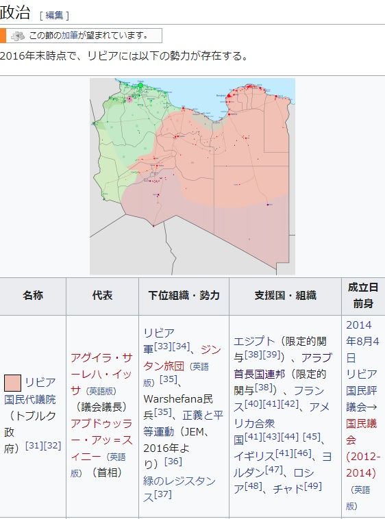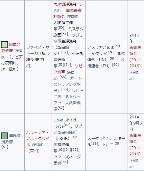 ​(5)その後, 国民統一政府の上級閣僚から成るシラージュ国民統一政府首相 を議長とする首脳評議会が,2016年1月に代表議会に対して政治合意案及び組閣案を提出したものの,組閣案は否決され,正式な樹立に至らず。同年3月に首脳評議会がチュニジアから首都トリポリに拠点を移すことに成功したが,両議会の政府は存続し続けているため,3つの政治勢力が国内に並立する事態となった。同年8月にも首脳評議会は修正組閣案を代表議会に対して再提出したが,否決された。​