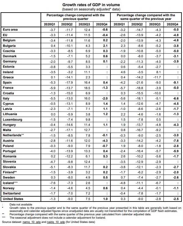 2020年第4四半期の前年同期比ではユーロ圏▲5.0%、