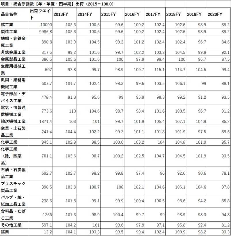 鉱工業出荷指数では全体と製造工業は同率の落ち込みで