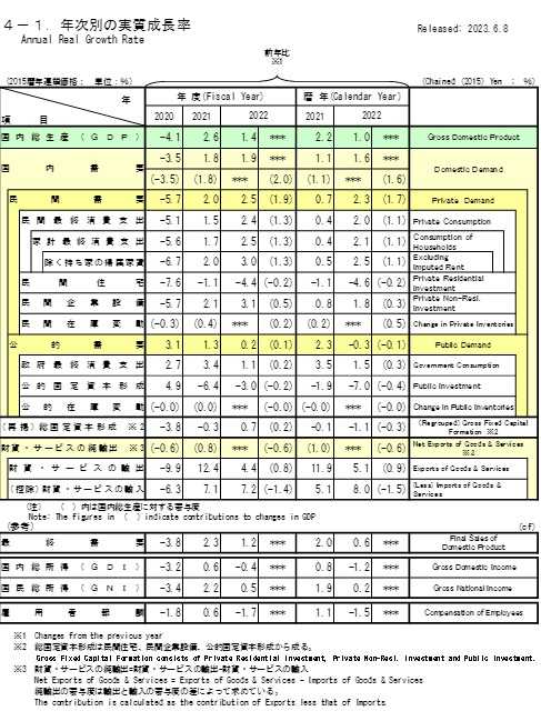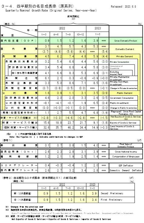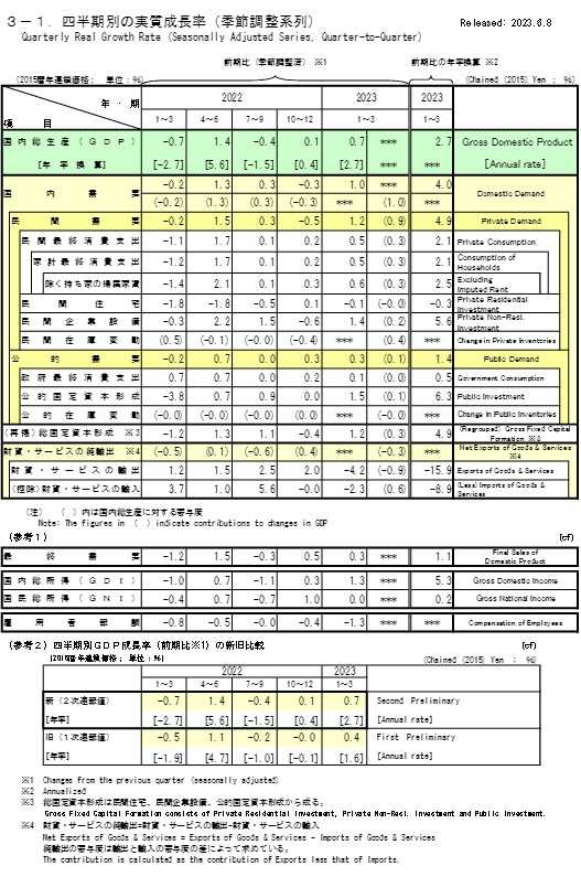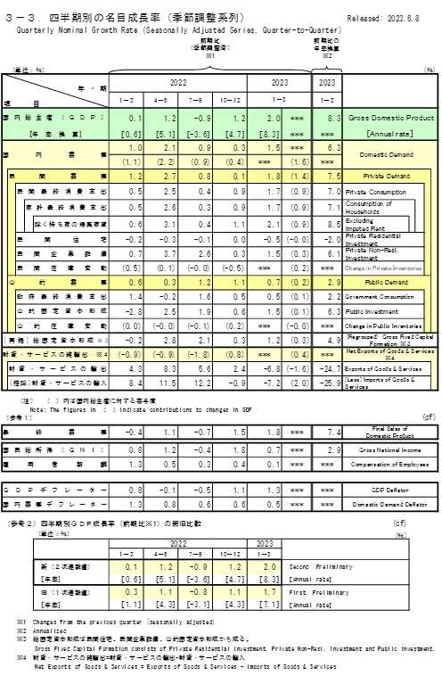 ​​​ 内閣府が8日発表した2023年1~3月期の国内総生産