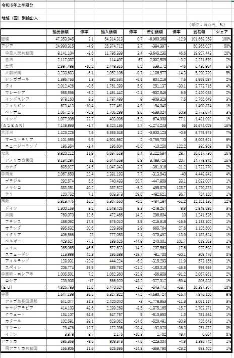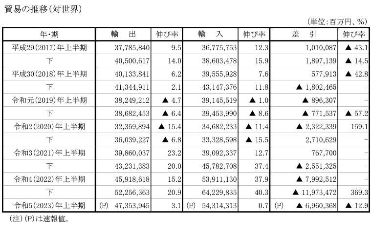 の貿易統計(速報)によると、全体の輸出額から輸入額を