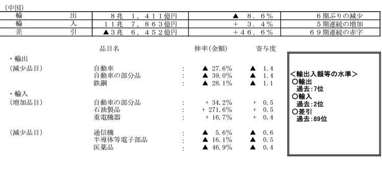 中国への輸出が鈍い。輸出額は11%減少して1兆5183億円と