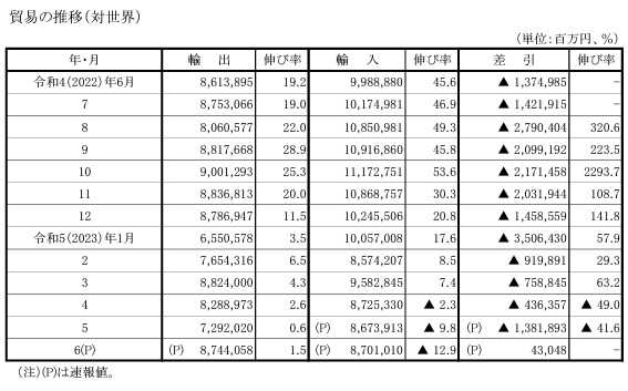 6月の輸入は8兆7010億円と前年同月比12.9%減った。