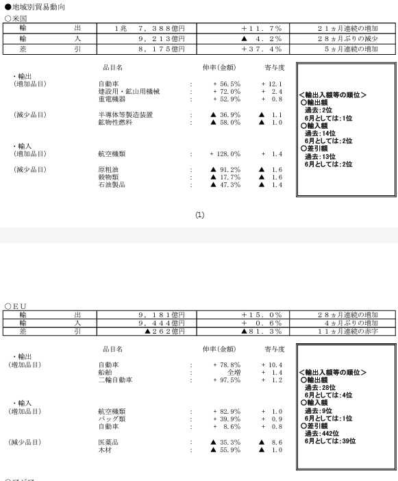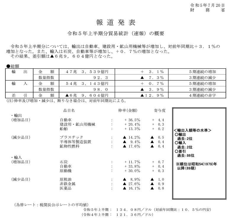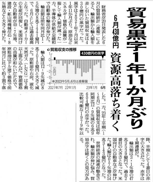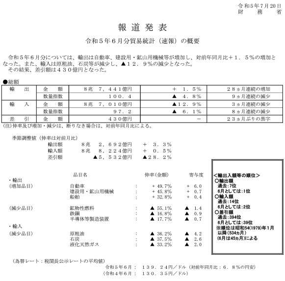 同時に発表された6月の貿易収支は430億円の黒字だった。