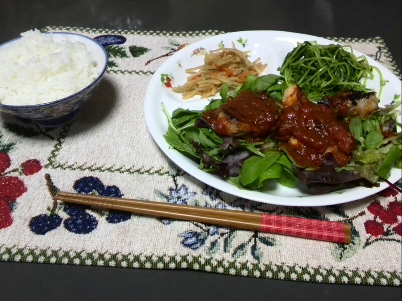 今日は思ったほど雨がひどくならず1日中シトシトと降っている感じでしたがこの時間になって雨脚が強くなって来ました。皆様被害などありませんでしたでしょうか?今日は下にたっぷりとベビーリーフを敷いて豚ロースのトマトソースにしてみました。野菜たっぷりですが、豚ロースが113gと多めなのでカロリーはちょっと高いですね^^;