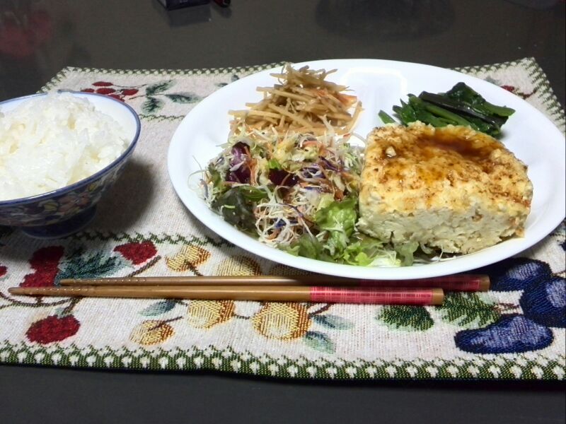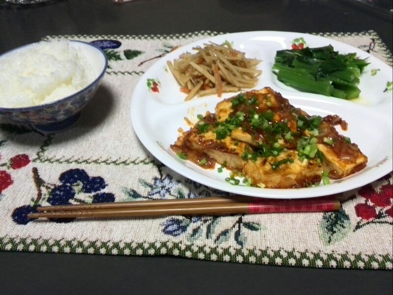 大型のW台風の動きが気になりますが今のところの予想では少しずれてくれそうでしょうか?大島の方たちの避難も始まったとか。これ以上の被害が出ないことを心より願います。さて今日はこんなものを作ってみました♪レシピはこちらお豆腐の水切りだけしっかりしておけば オイスターソースがきいていて味がしっかりつくのでとってもおいしかったです♪あとはつるむらさきのおひたしときんぴらごぼうです。