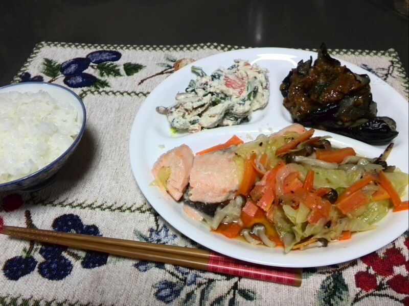 昨日は震え上げるほど寒かったのに今日はまたすこし汗ばむほどの陽気。。。でも昨日が寒すぎたので今日はちょっと(´▽`) ホッとしました♪今日はこれを作ってみました。…c(゚^ ゚ ;)ウーンやっぱりちゃんちゃん焼きかな?味付けがポン酢ってだけで。そして 味はおいしかったのですが、火加減が強すぎたのか一番下に強いた玉ねぎ(ここですでに順番間違えているのですが^^;)が全部焦げてしまいましたo(TヘTo) クゥ添えたのはほうれん草の白和えとなすの肉ミソ和えだったのですがボリュームありすぎてなすは食べ切れませんでしたw