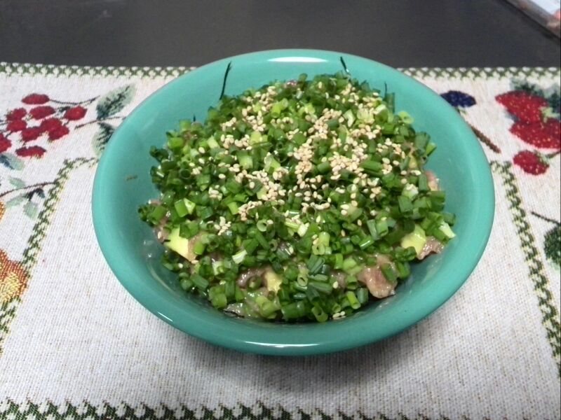 今日から寒くなる予報でしたがお日様たっぷりで思ったほど寒くなかったような気がするのはわたしだけでしょうか?ただ 日差しが冬の日差しになって部屋が薄暗くなる時間が早くなったみたいです。昨日一昨日のキムチ鍋で塩分を摂りすぎたと思うので今日は定番「ねぎたっぷりアボカドねぎとろ丼」です。前回の検査で前日の夜これにしたのですが、摂取塩分量は4g台だったので間違いないと思います♪