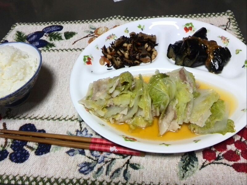 今日は寒かったですねぇ~><去年の一番寒い時期も昼間はヒーターつけないでいられた気がするのですがまだ身体が慣れてないせいか、今日は消すと寒いのですぐにつけてしまいました^^;それに・・・雨こそ降らなかったものの 今日も雲が多くて。スッキリした晴れはいつになったら拝めるのでしょうか?毎年この季節になると刺激される「ほんだし」のCM!今日は豚バラと白菜の重ね蒸しです。本当は土鍋で作って最後はご飯を入れて雑炊(。・ρ・)ジュルにしたいのですが・・・一人分の量を量りたいのでお皿に盛り付けました。ちなみに塩分を少なくするために残念ながら「ほんだし」は使っていません。豚バラに塩麹をぬっておいて あとはだしを200cc入れて蒸してます。自家製だしわりぼん酢はかけてますが、少し味が淡白なのでひじきの煮物となすの肉味噌和えを添えてます。