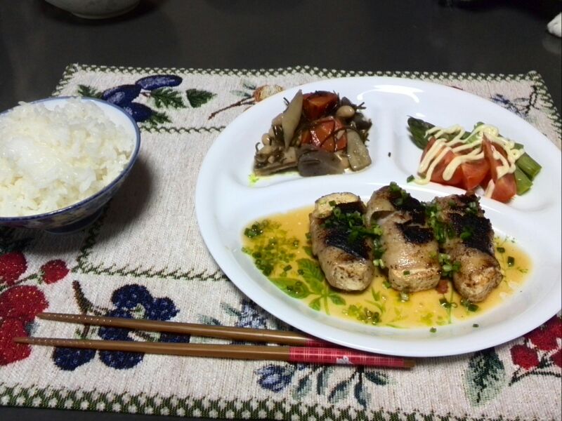 確か昨日の天気予報では今日が3連休で一番おでかけ日和と言っていたようなそして今朝の天気予報では今は曇ってますが午後には晴れて~なんて言っていたようなそれがお昼の天気予報ではおでかけの際は傘をお持ちくださいになり外を見るとどんどん厚く黒くなる雲。。。さすがに不安になり洗濯物を中に入れた途端に雨 (´ー`)┌フッ今日はそんなに予報が難しい天気だったんですかね?さて 今日は豚バラがあったのでお豆腐に巻いてみました。これで甘辛く煮たらおいしいだろうな・・・と思いつつそれでは塩分が不安なので(ノ_・。)シクシク豚バラに塩麹をしてから巻いて だしわりポン酢をかけていただいてみました。これがなかなかおいしかったです♪ただ・・・肉に豆腐・・・たんぱく質の摂り過ぎがちょっと気になりますが^^;