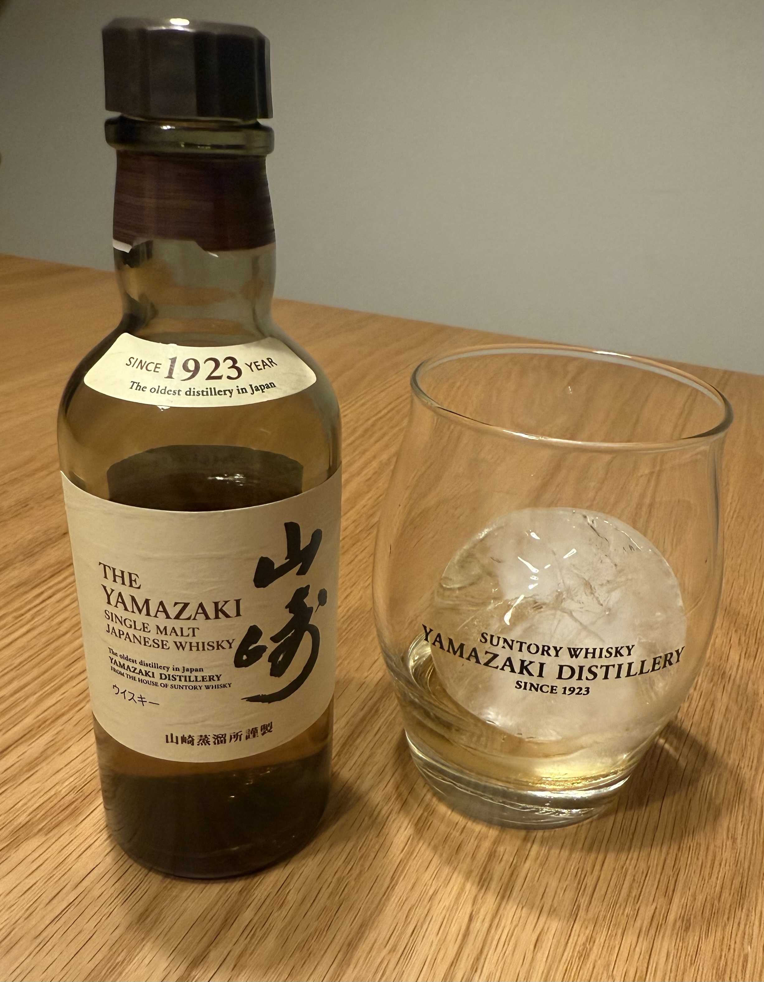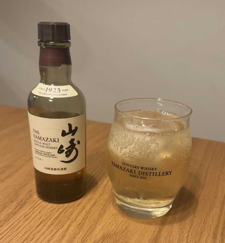 山崎ウイスキー🥃を少しだけのもー!炭酸がないためロックやっぱりまだロックを楽しむのには早くてハーフロックにするちなみに山崎はコンビニで時折入荷されるミニボトル180㎖で普通のボトルは700㎖かと2145円だったかな?