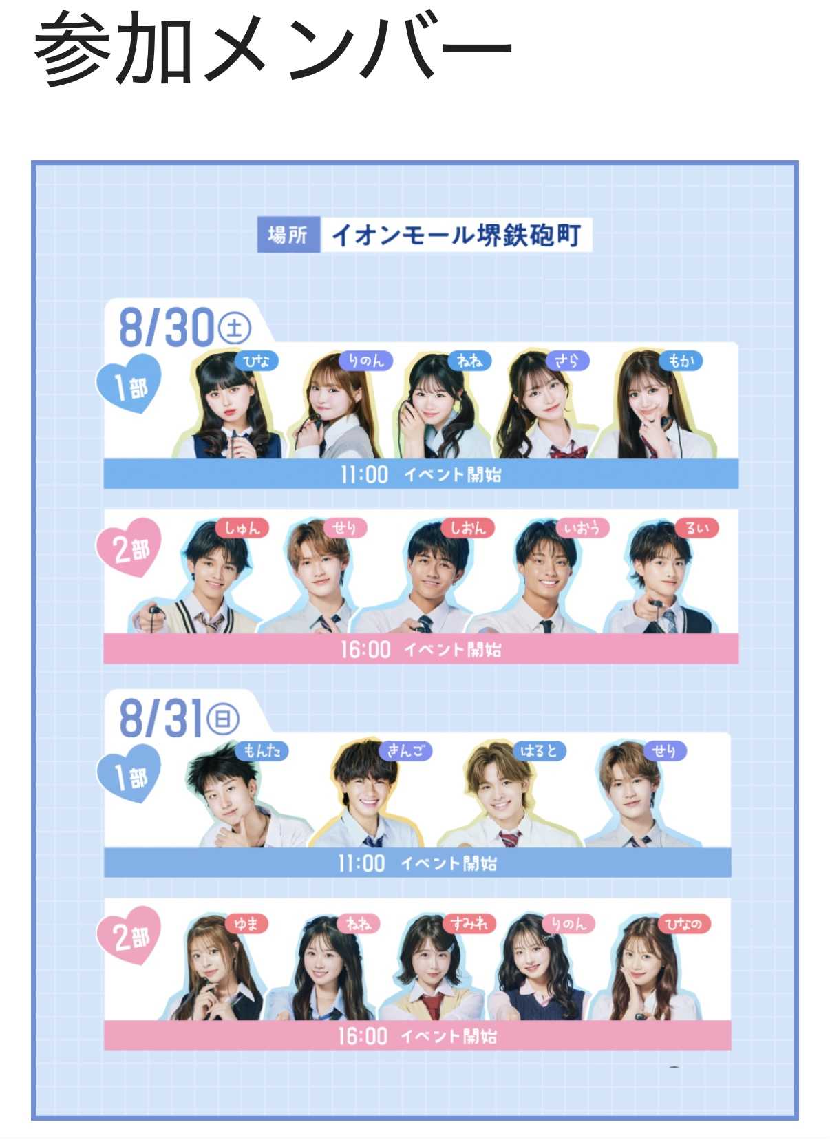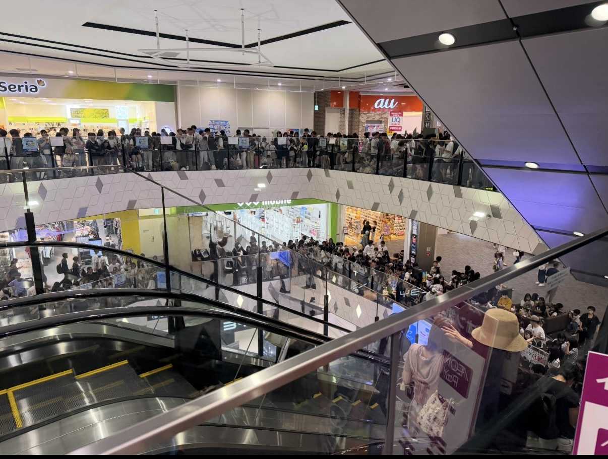 イオンモール堺鉄砲町にて今日、好きになりました。真夏のミーグリ2025を家族がファンで参加しました。8月31日(日)は1部:もんた/きんご/はると/せり2部:ゆま/ねね/すみれ/りのん/ひなの/ひなが参加されていたようで、うちの女性陣は大興奮でした~2Fや3Fからも無料見学は可能でしたが、開店同時にならんでいる方が多く昼頃に行くと背伸びをしてギリギリみれるかなって感じでした。観覧者は若い子が多いのは想像通りでしたが、意外と女性だけでなく男性も多くはじまると参加者の名前を叫んでいたりして男女問わず人気があるんだと驚きました。どんどん人が集まってきてめちゃくちゃ室内なのに暑かったです。家族はチケット予約もっと頑張ればと言ってましたが、結果的には明日の配信が楽しみと喜んでて良かった😊