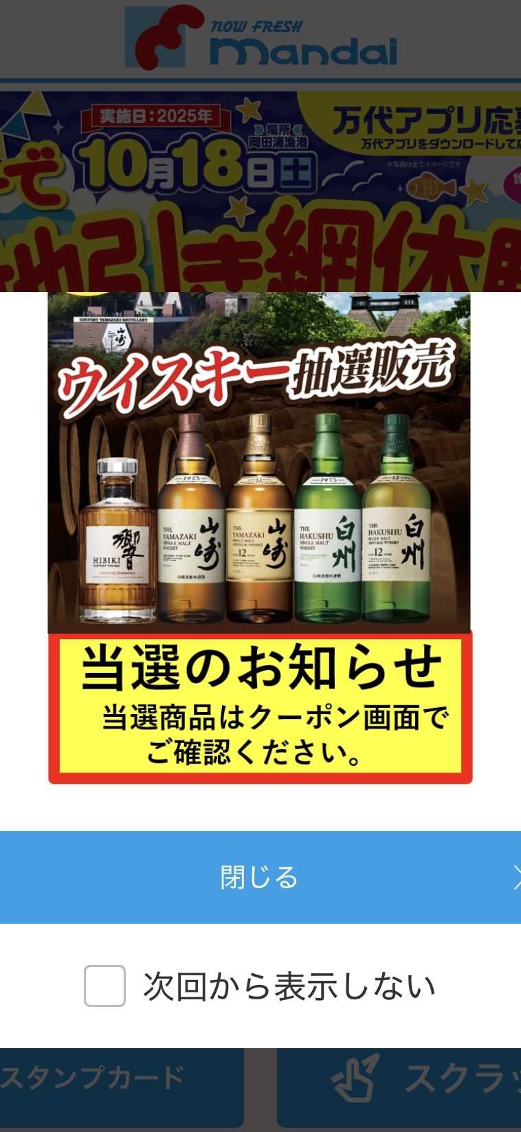 スーパー万代のアプリにて抽選にて購入権利をゲット!今回はサントリー響JAPANESEHARMONY700ml 本体7,500円(税込8,250.00円)にしました!
