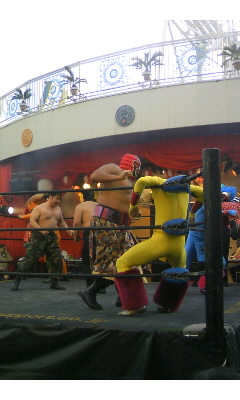 米兵ジョーの後ろにはおばけ屋敷の花嫁幽霊、今日だけ覆面被り?総括するのは菊・・・モモタロー。パンダカーロボ、疲れてる・・・キングのローラーコースター。全レスラーが園内のアトラクション名にあやかっているとか。後ろのビックリハウスに途中モモタローと米兵ジョーが消え去りました。ベルトを掲げるミス・花やしき。浅草のせいか和服も嫌味が無くて本当に奇麗。後ろはマスク・ド・Bee。ベストタッグの風神・雷神。一体何者か気になる・・・後ろピンクのリングアナは吉江豊の兄で芸人だとか。「パンクラスはホモばかり~♪」と、歌いながらサインをくれたMr.スワンが何者かも怪しいですが、これだけの凄腕、一体誰かと思うばかり。後楽園ホール気分のリピーターも私たちだけでも無かったようです。私のご贔屓はメリーさん。残念ながら画像にはありませんが、華奢な身体での空中殺法の弧がやたら奇麗で握手の手にも覆面の下から目チカラを感じましたね。あれだけの技、アマレスとは思えず、DDTメイン説もあるようですが、はっきり分からず。気になる・・・いずれにせよ、こんな機会が無いと知り合えないし、恐れ多いですよ、こんな安値じゃ。値段というと、花やしきの缶コーヒー100円!お客さんに感謝している分だけ愛されているからこれだけの企画が組めるのでしょう。見習えよ東京ドームも。いつだ?今度は