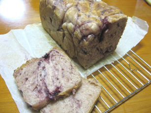 久々に焼いた紫芋の角食パン。イースト、砂糖少なめ。発酵後急冷し、ねじって塗ったブルーベリージャムと芋の甘みだけでも食べられそうです。ショートニング、スキムミルクを抜いたことで容器の上まで膨らんでくれたのかな。シンプルなほど良いことがやっと分かりました。炊飯器での発酵は難しいと思ったけれども温度計、ビニールを使えばどうにかできそう。ちょっとフカフカ過ぎるので食べ頃は明日だ~