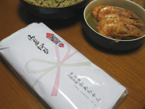 立ち飲み屋かあちゃんから戴いたタオル。バックは夕飯の蒸し赤エビと卯の花・・・
