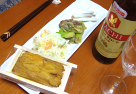 まずは我が家の晩酌メニュー、マグロぬた、ポテサラ、エシャ、ウニ・・・でもメインはハチブドー酒。先日神谷バーで購入したものです。まずは口当たりの良さに「おいしい!」の第一声。グラスをかざすと赤の向こうに透明感が潜んだようで独特な感じ。うむうむ・・・。ワインとブドー酒は別物だそうですね。ブドー酒って初めてでしたが、とにかくハチさんの考えた、ブドー酒というもののファンになりましたよ。・・・先週、初めて行った浅草神谷バー。土曜とあって昼間っから満席。ご案内は特に無く、空いてる隙間に座れというのが暗黙の了解?食券制でした。私と友人の前に運ばれてきたオンザ・ロック。定員 「あちらのお客様からです。」ニコリと笑う老紳士。55年もここに通い続けているそうです。その紳士はせわしなく、あちこちの常連さんと乾杯しながらも、長~い長い自慢?昔話。ふう~っ。今夜の獲物とされた私と友人は逃げるタイミングを見計らいながらも、人情たっぷり、神谷初体験を案外楽しく満喫したのでした。(かきフライ旨かった~)
