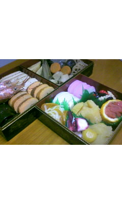伊達巻は赤玉オレンジ色。のし鶏は豆腐入り。チョロギをもらって黒豆がふくふくです。