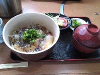 テニスの後に軽く昼食。 国分で安くて旨いで人気のあるというお店に連れていってもらいました。新鮮な烏賊、鯵、カンパチの漬け丼¥600。確かに安くて旨い。