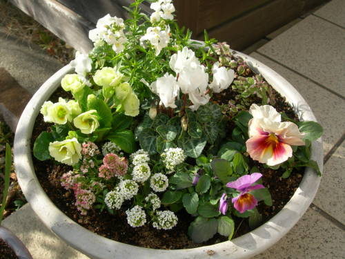前回の日記に書いた寄せ植え2つ画像のUPをしておきます。ひとつめは春色のパンジーとマスカット色のジュリアン(プリムラ)ピンク×ホワイト×ライムグリーンの組み合わせほかにシクラメンやアリッサム、ビオラもmixいまさらですが、秋に植え損ねた球根チューリップ(マウントタコマ/白)を仕込みました。球根はあまり良い状態ではなかったので綺麗に咲く補償はありませんが…(当然ですね )もうひとつは大好きな黄色のスイセンティタティタ(テータテート)とビオラスイセンの黄色をビオラの中心にリンクイエロー×パープルの反対色の組み合わせなので和らげる挿し色にアリッサムのホワイトを入れています。こちらもチューリップの球根(クリーム×ワイン)を入れています。球根はいつも植え時を逃してしまうんですよね。購入してすぐに大半は適期に植えましたが色の組み合わせとか考えて余ってしまった球根を悩んでいるうちにすっかり忘れ…毎年のことなのでやはり一気にきちんと植え込まないとダメですね。まだ若干すっきりした感じですが春になってそれぞれが大きくなる分のスペースを確保してあるためです。モスとかでカバーしても可愛いかな。(寒さ除けにもなるし)あふれるように咲く春が待ち遠しいです