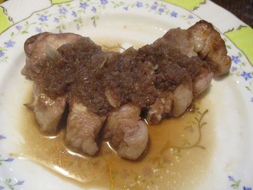 玉ねぎとニンニクをおろしたものに肉を30分ほど漬け込んでおき、肉を焼いた後に火が良く通るように赤ワインで蒸し焼き。