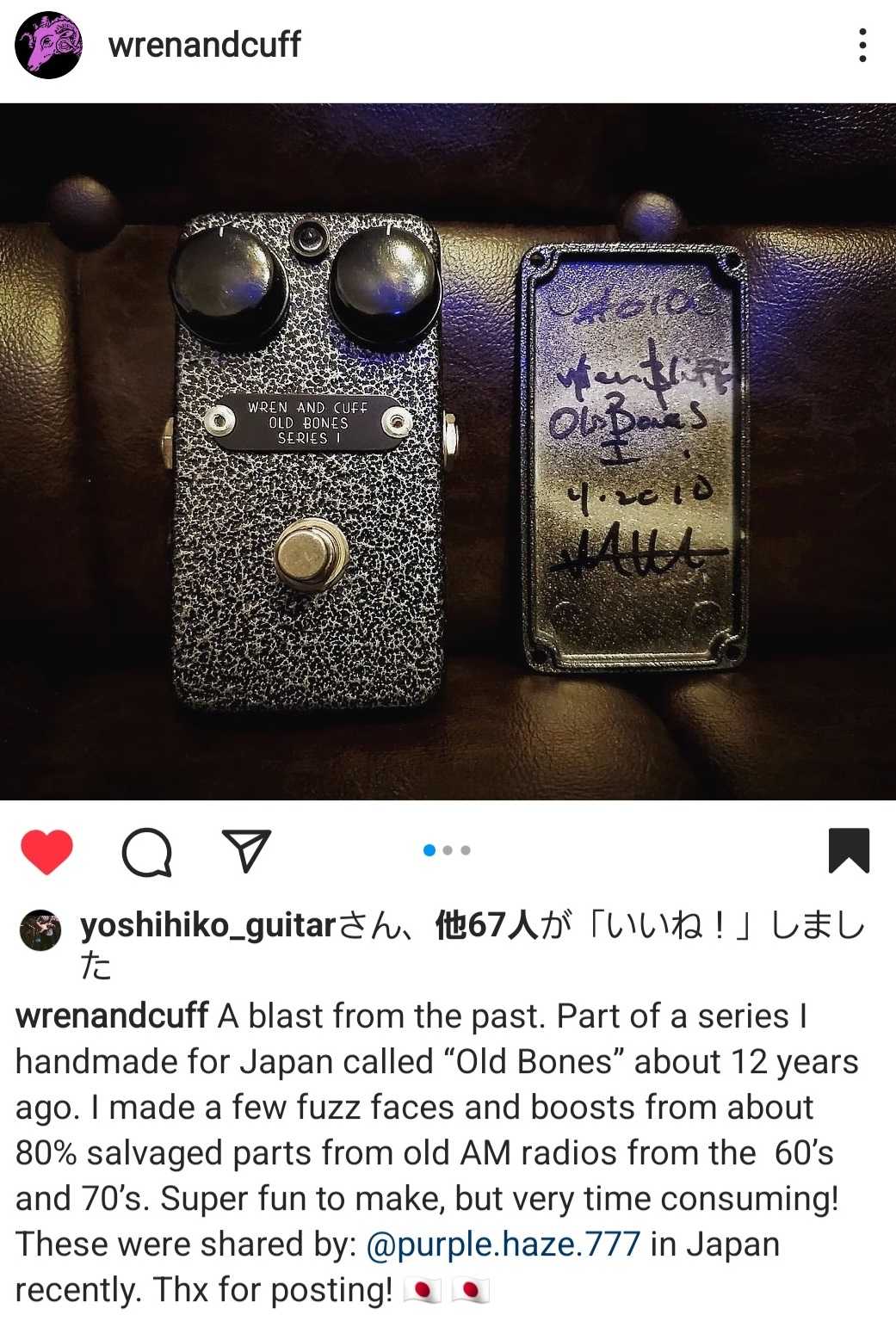 知り得る限りWren and Cuff Creations Oldschool Fuzz Faceとしては、このシリアルNO.001。