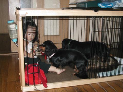 私の実家には、犬(ミニチュアダックス)が2匹・猫が1匹います。小型犬は、よく吠えるので、実家に遊びに行くと最初は怖がって、私や母から離れない七海ですが、そのうち犬とも仲良しになって、遊んでいます。 犬小屋ってかゲージの中で、犬達にご飯をあげていますなかなか仲良ししてます♪ 犬がドックフードを食べているのを、横から必死でのぞきこんでは『おいしい?おいしいの?』って聞いてます犬がおいしそうに食べているせいか、一度ドックフードを犬のように顔を突っ込んで食べた経験のある七海。さすがにコレは怒ったんで、それ以来、食べようとしなくなりましたが、まだまだ油断大敵です 最近は、どんどんとやんちゃで悪そうな顔になってきました行く末が怖いです。ちなみに、このゲージの中は、もちろん犬の毛まみれ・・・。家に帰ると、玄関で全部の服を脱がしても、ひっついてくるのか2・3日は家の中から犬の毛が見つかりますでも、『あれダメ!これもダメ!』って言うのもなぁ。。。。と思って我慢してます。