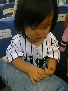 今日は、京セラドームに行ってきました そう、タイトルにもある通り、阪神vs中日を観戦してきました。 私は、阪神ファンではありません。 清原ファンなんで、今はオリックスバッファローズファンです。 そんな私が、なぜ阪神を・・・ これには事情があって、私が母と『阪神VSオリックス戦なら見たいね~!』と話していたら母の再婚相手のお母様が勝手にチケットを知り合いに頼んでくれたのですがそれが『阪神VS中日戦』だったのです(笑) 私としてはナイターだし微妙だったんですが、チケット代はいらないと言われたのと この取ってくれたチケットが内野指定席の前から7番目だったんで行く事に。 (なんとこのチケット1枚5000円ですって・・・) 座席は、ちょうど一塁が、目の前に見えるあたりでした。 やっぱり近くで見ると迫力が違いますね 私はオリックスの試合しか生で見た事がないんで あまりの人にビックリしました。 応援もすごいし、ファンの意気込みもすごい 阪神の外人選手を退場にした、一塁の塁審の森さん ものすご~くやじられて、ドームにいる阪神ファンから『帰れコール』されててなんかかわいそうになりました。 私が、森さんの親だったら見てられないね・・・ 阪神ファンって、本当にこわいのね・・・ そして、今日1番の私の中のヒットは、濱中の歌(笑) なにあれ~?(爆笑)ファンの人しか分からないんでしょうけど、 なんかバラードちっくな応援歌で『はまなか~、はまなか~』って その歌を聞きたいが為に、濱中の打順が楽しみでした 私も歌詞覚えて歌ってみたいわ~(笑) 七海も濱中の打順が来たら『はまちゃんがんばれ~』と応援してました。 そして今回、中日のファースト守ってたお尻のプリっとした黒人さんが投げたボールが私のトコに。 欲しいけど、七海もいるし手を出せないでいると、一緒に行った私のイトコの旦那様(190cm)がGetしました! にしても、私が試合見に行くと必ず応援してるチームが負けるのよね・・・。今回もしっかり負けました はまちゃんのサヨナラかと思ったんだけどねぇ・・・。 今回の試合観戦にあたって、ミーハーな母が、 私と七海のユニホームを買ってくれたので、 また阪神戦、応援しに行こうっと それまでに、濱中の歌覚えたいなぁ
