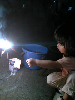 昨夜、今年初めての花火をしました♪ 去年は、七海は見てるだけでしたが、今年はしっかり参加しました♪ 手持ち花火ばっかりを玄関の前でやったのですが、 ちゃ~んとしゃがんで、しっかり手で持って『きれ~ね~♪』と何度も言いながら楽しんでいました。 終わった花火は、ちゃんとバケツにポイ!も出来るようになったんで、今年はいっぱい花火が出来そうです♪ でもね、やってる最中はいいの。 問題は終わってから・・・。 子育てしてる方なら、誰しもが経験するアレ。 そうアレです。 終わっても「まだする!」と言って大暴れ! もうないと言ってもダメ。 しかーし、私ももう子育て2年生y(^ー^) 玄関を開けたトコに七海の好きなヤクルトを置いておいたのです♪ それを見せて七海を誘い込みます。 『てて洗って、ジュス飲も~う♪』と誘うと成功!! そのうち、この技も使えなくなるんだろうなぁ・・・。