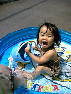 もう梅雨も明けたのでしょうかものすごく良いお天気でしたねあまりに良い天気なので、ビニールプールを引っ張りだしてきて、プールの準備をしました最近は、昼間に1回シャワーをしてるんですが、プールをしたらそれもしなくていいんで一挙両得です(笑)去年と違って、今年はすごく楽しそうなかなか、いい顔してるでしょ右下にあるのは、私の足です(笑)あまりに暑いんで、足だけプールしちゃいました♪お風呂だったら、頭から水をかけたら泣くのに、プールだったらバケツでジャバーっとしてもケロッとしてます今年は、いっぱいプールするぞ~♪
