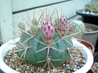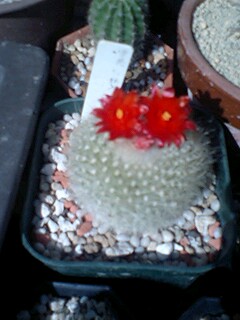 前回の記事ではピンボケ写真だったので再び携帯電話での撮影に挑戦しました。ギムノカリキウムの園芸品種です。先週うちの庭に仲間入りしました。大きさは直径7センチほどです。100円ショップで購入して冬越しさせた小苗たちです。うまく育てればいい味が出るかもしれないと期待しています。新棘が出始めました。写真ではちょっとわかりませんね。レブチアの宝山です。三角柱に接いでありましたが、冬越しのときに凍傷にかかったので切除しました。今は根無しで土の上においてある状態です。どんな色の花が咲くんでしょうか。今回はお手軽に携帯電話で撮影しました。カメラを引っ張り出すよりずっと楽ですね。