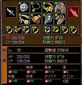 剣士lv97で,鎧クエでフルヒ稼ぎつつ経験値20万もらってこつこつlv上げしています。コロは毎回友ハンだらけだし,廃坑秘密はだるいし。やってられないのでlvあがってません。Gvは.WIZから犬になったすぱろぼは,やわらかい人に20だめくらいしかでないし,トワー剣士は7-10ダメほどしかでません。まぁそれでも復活直後とか他人がものすごく削ってくれてればたまに落とせます。あまりRSやる気もないので進んでませんがこんなところ。