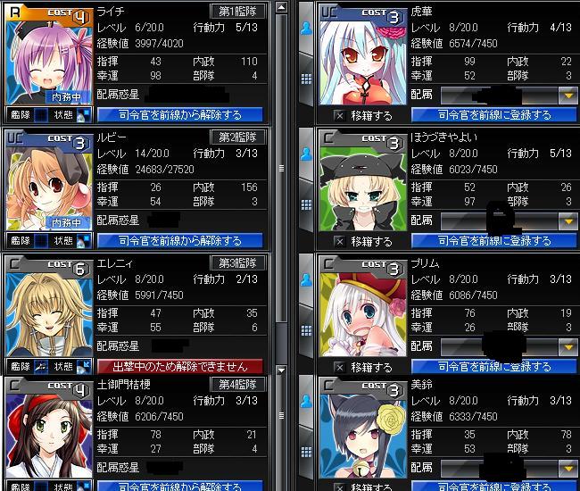 ブラウザゲーをぽちぽちし始めました一騎当千は7鯖、銀河大戦はぱいろん鯖萌え絵ばっか^^;ブラウザ三国志は人多すぎて戦争まみれになりそうだし鯖多すぎて怖かったwトラビアンのような思いはたくさんだまずは銀河大戦毎日2名雇えるようにしてるから数がそこそこ増えてきたキャラの右上の3とか4とかの数字がでかいほど強いって感じ、ほとんど3ですな6はクエストでもらえる弱めの6。現状はこいつだけなので重宝してます5以上のキャラが欲しい地味に連合=ギルドに誘ってもらったので入ってます一騎当千1月半と長くやってるのでレアがちらほら。UC孫権はこれからスキルあげてく予定。今期はこのキャラだけだなー。R陳宮は隠しで弓闘閃陣を出す素材。両方あげて孫権に閃陣を付与してく感じ。左下のレアは鯖開始キャンペーンでもらったレア。こいつを単騎扱いでもう少しあげていきたい誰も誘ってくれないので完全ソロ農民。なのに資源がいまだ全種5000いってなくて絶望的w暇があれば操作する系なので朝晩土日だけかな寒くなって布団からできにくくなったので朝を飛ばす率が増えたw