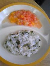 ツナとわかめご飯・トマト、玉葱、パプリカ、ナスのラタトゥユおかかご飯・カボチャとサツマイモのミルク煮ひじきご飯・鮭の人参、キャベツあんかけこの他、朝にすりおろし林檎、昼にバナナ。スプーンを取ったり、お皿に手を出してくるから、そろそろつかみ食べかなと思いバナナで挑戦なんだいつものバナナと違うぞ手で取ってみるパクッうま~い息子くんはアレルギー検査で卵、ミルク、小麦、大豆にひっかかりました。卵はクラス4と数値が高かったため除去。それ以外のものは少しくらいなら・・と言われたけど怖くてあまりあげてません。 納豆、豆腐が発覚する前に食べて何もなかったので食べさせてます。卵がNGだと食べれないものが多く小麦も・・・パンとか麺とか食べさせてあげたいなぁ米粉を使った代替品とかあるし、栄養が偏らないようにしないとです