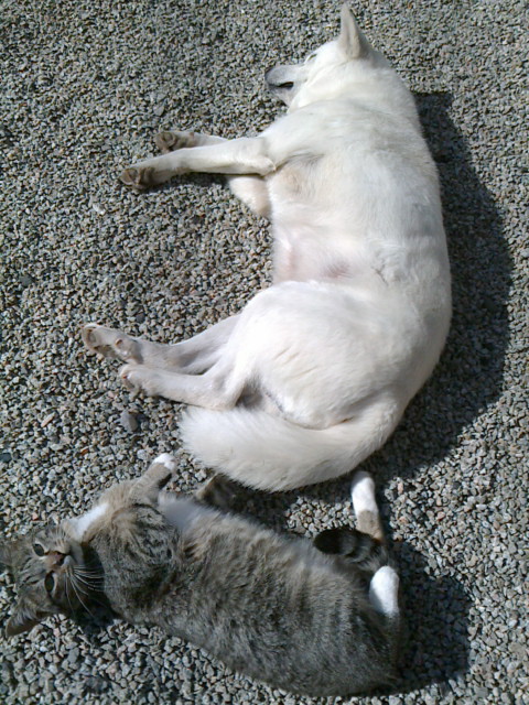 ワンコとニャンコが仲良く日向ぼっこ