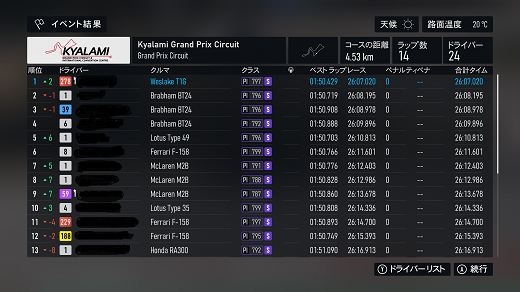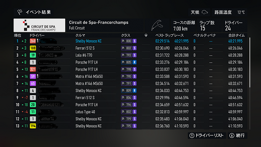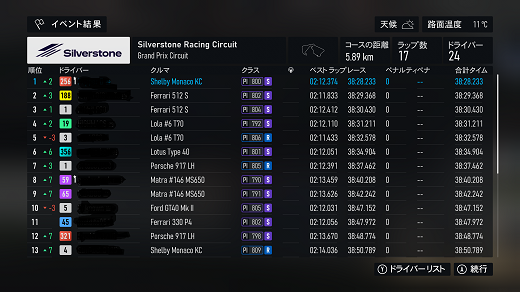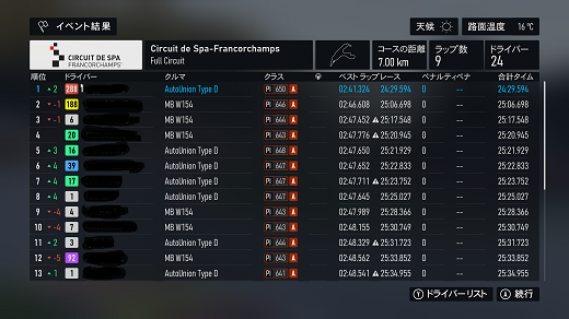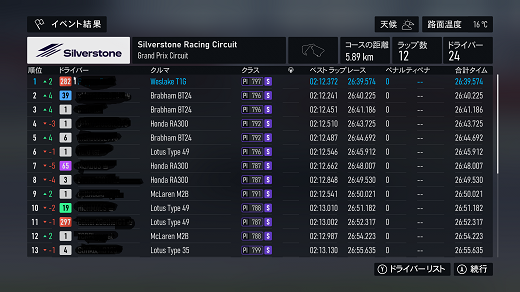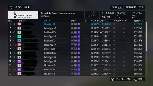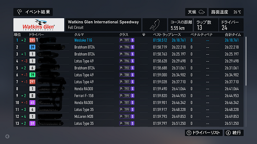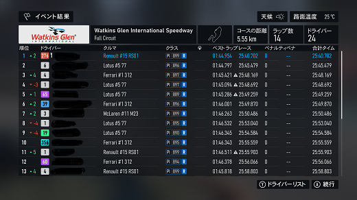 無課金プレイは終了し、所持装備枠の問題から港を拡張してしまいました。(現在は計36000円使って最大艦船470に拡張しました)提督レベルは120です。リニューアル後のMAPは一通りクリアし、7-5までクリア。箱コンソールプレイの新FMの話、シングルシート3シリーズ目開始、60年代F-1(全4戦)で、1戦目はキャラミ14周、(透過モード:オン トランスミッション:AT TCS:オン ABS:オン ドライバーレベル:4)ミディアムタイヤで走っててなんかおかしいと思ったらタイヤ消耗x1だったのね。(ただ性能差(特にタイヤ)がほぼ無い上、曲がれる速度も同じなのでかなり厳しい戦いで、14周も息抜きできないから集中力が切れやすいんだよね)14周走ってタイヤ6割残ってたんで、ソフトでも持ちそうな感じ?(ピットイン目安信用できないからなぁ)60年代のF-1にはリアウイングが無いので、リアタイヤの限界が低くオーバースピードでリアを流すと失速で抜かれる可能性が高くなるので、リアタイヤ管理の腕前の勝負になる。(タイヤ消耗x1でミディアムタイヤならドリフトコーナリングもアリかもしれないが)次戦はスパ10周だけど、予測ではノーピットらしいけど、ソフトで行ってみるか?(ミディアムだと派手なミスすると抜かれそうなプレッシャーあるからなぁ、難易度4でもATだと)あと、ピットイン無し&ソフトタイヤで走れるなら証拠のスクショも特にいらないかなぁ。(ATでもこれだけのタイムは出るという証拠にはなるが) 現在の主要艦船戦艦長門改二(99)陸奥改二(99)金剛改二丙(99)榛名改二乙(99)比叡改二丙(99)霧島改二丙(99)武蔵改二(99)大和改二(99)ビスマルクdrei(99)イタリア(99)ローマ改(99)Iowa改(99)Warspite改(99)ガングート改二(99)RichelieuDeux(99)Nelson改(99)Cororado改(99)Shuth Dakota改(99)Washington改(99)Conte di Cavour nuovo(99)Maryland改(99)Massachusetts改(99)Jean Bart改(99)Nevada改mod2(99)Rodney改(99)Valiant改(99)航空戦艦扶桑改二(99)山城改二(99)伊勢改二(99)日向改二(99)正規空母赤城改二(99)加賀改二(99)蒼龍改二(99)飛龍改二(99)瑞鶴改二甲(99)翔鶴改二甲(99)大鳳改(99)雲龍改(99)天城改(99)葛城改(99)SaratogaMkII Mod2(99)Aquila改(99)Ark Royal改(99)Intrepid改(99)hornet改(99)Graf Zeppelin改(99)Victorious改(99)Ranger改(99)Lexington改(91) 軽空母千歳航改二(99)千代田航改二(99)龍驤改二(99)瑞鳳改二(99)瑞鳳改二乙(99)飛鷹改(99)隼鷹改二(99)鳳翔改二(99)祥鳳改(99)龍鳳改二(99)大鷹改二(99)神鷹改二(99)鈴谷航改二(99)熊野航改二(99)Gambier Bay Mk2(99)雲鷹改二(99)Langley改(99)潜水艦伊8改(99)伊19改(99)伊58改(99)伊168改(99)まるゆ改(99)呂500(99)伊401改(99)伊14改(99)伊13改(99)伊504(99)伊26改(99)伊47改(99)伊400改(99)伊203改(99)伊201改(99)Scamp改(99)Salmon改(99)伊503(99)Drum改(99)伊41改(99)伊36改(99)Wahoo改(50)水上機母艦千歳甲(87)千代田甲(87)瑞穂改(97)日進甲(99)神威改(90)CommandantTeste(96)三隈改二特(99)航空巡洋艦最上改二特(99)三隈改二(96)鈴谷改二(99)熊野改二(99)利根改二(99)筑摩改二(99)Gotland改二(99)能代改二(99)矢矧改二丙(99)他の”改二”艦船妙高改二(99)那智改二(99)足柄改二(99)羽黒改二(99)衣笠改二(99)摩耶改二(99)鳥海改二(99)古鷹改二(99)加古改二(99)Zara due(99)北上改二(99)大井改二(99)木曽改二(98)夕張改二特(99)五十鈴改二(99)那珂改二(96)神通改二(96)川内改二(97)阿武隈改二(99)鬼怒改二(99)由良改二(99)多摩改二(97)天龍改二(99)龍田改二(98)球磨改二(95)睦月改二(94)如月改二(94)皐月改二(94)文月改二(94)吹雪改二(95)白雪改二(94)初雪改二(94)綾波改二(94)敷波改二(95)浦波改二(94)磯波改二(94)深雪改二(94)叢雲改二(94)初霜改二(94)暁改二(93)夕立改二(98)時雨改三(98)春雨改二(93)江風改二(94)海風改二(94)初春改二(93)荒潮改二(94)大潮改二(94)満潮改二(94)潮改二(98)曙改二(93)霞改二乙(98)霰改二(98)朝潮改二丁(94)天霧改二丁(98)長波改二(97)朝霜改二(94)早霜改二(94)村雨改二(93)陽炎改二(94)不知火改二(94)黒潮改二(94)親潮改二(94)早潮改二(93)天津風改二(94)白露改二(94)秋雲改二(93)夕雲改二(93)巻雲改二(93)風雲改二(95)沖波改二(93)高波改二(93)藤波改二(94)浜波改二(93)清霜改二丁(95)山風改二丁(93)雪風改二(99)初月改二(98)ヴエールヌイ(96)Z1zwei(93)Z3zwei(93)フレッチャーMk2(99)サミュエル・B・ロバーツMk2(98)稲木改二(94)轟沈(3名)陽炎改(21) 4-1ボス戦(囮用)伊168(19) 2-3ボス戦皐月改二(82) 2-2ボス戦未入手艦船一覧戦艦コンプリート!空母コンプリート!重巡洋艦コンプリート!軽巡洋艦コンプリート!駆逐艦夏雲潜水艦コンプリート!海防艦コンプリート!その他コンプリート!