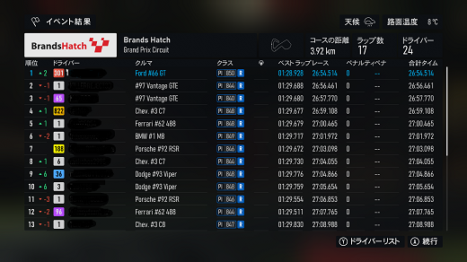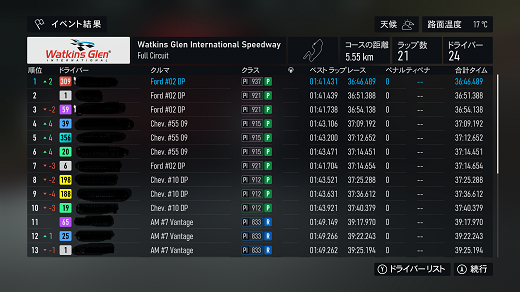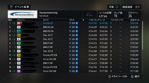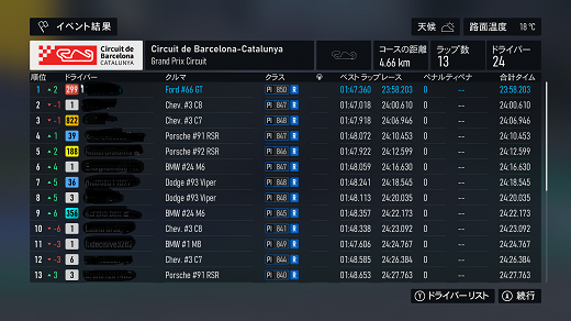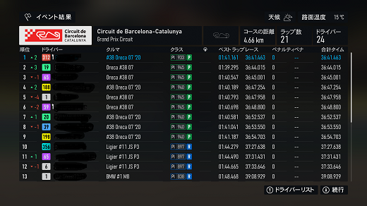 無課金プレイは終了し、所持装備枠の問題から港を拡張してしまいました。(現在は計36000円使って最大艦船470に拡張しました)提督レベルは120です。リニューアル後のMAPは一通りクリアし、7-5までクリア。昨日も最低限のプレイのみ、艦これは特に書くこと無いわ。箱コンソールプレイの新FMの話、耐久ツアーシリーズ(全6シリーズ)、4シリーズ目ヨーロッパLMP2(全3戦)タイヤ消耗x4、ヨーロッパLMP2(全3戦)で、1戦目はカタルーニャフル21周、(透過モード:オン トランスミッション:AT TCS:オン ABS:オン ドライバーレベル:4)4シリーズ目開始だが、個人的に扱いにくいので、あえてバラスト2段階積んでるのでPIがライバルより低めになってます。ライバルはミディアムタイヤ7周x3が多いが、バラスト2段階目で重量が増えてるので同じ戦略だと厳しい。(元々ATの苦手なコースだしね)タイヤは消耗を避けて早めの交換の、ハードタイヤ9周(限界は10周か)→ミディアムタイヤ6周x2(限界は7周?)でクリア。同じピット回数でも、消耗してタイムが大分落ちる7周目を回避するだけで、2回目のピットアウトで2位を確保できた。バランス強化で踏んでいけるこのバラストであと2戦やってみるわ。で、2戦目はムジェロフル21周だが、1戦目と同じピット戦略になるのかなぁ。別件話、「ウマ娘」の話、無料80連なんで、今日が多分最後のチャンスでRx1凸だった。チケ10連プラスしての最終結果はSSRx1(ダブリ)、新規Rx1だけという結果だったわ。関係ないけど、マックのチーチーがもうすぐ終わるので、朝マック限定(パンズが違うだけで普通にピクルス入ってて驚いた)を食べに行って、帰りにセブンに寄ったらミソキン(ラーメン&ライス)が普通に山積みされてたんで、お試しでラーメンの方のみ購入。(2種類あるんで、限定は2個まで)買い占めパワーは大分落ちてるらしく、入荷15分で完売してた勢いはないって言ってたわ。ミソキン食べるのは明日以降かなぁ、セブンプレミアムの半額バターチキンカレー(賞味期限8月31日)昨日食べで、今日は汁なしラーメンも買ってるので、その後になるので) 現在の主要艦船戦艦長門改二(99)陸奥改二(99)金剛改二丙(99)榛名改二乙(99)比叡改二丙(99)霧島改二丙(99)武蔵改二(99)大和改二(99)ビスマルクdrei(99)イタリア(99)ローマ改(99)Iowa改(99)Warspite改(99)ガングート改二(99)RichelieuDeux(99)Nelson改(99)Cororado改(99)Shuth Dakota改(99)Washington改(99)Conte di Cavour nuovo(99)Maryland改(99)Massachusetts改(99)Jean Bart改(99)Nevada改mod2(99)Rodney改(99)Valiant改(99)航空戦艦扶桑改二(99)山城改二(99)伊勢改二(99)日向改二(99)正規空母赤城改二(99)加賀改二(99)蒼龍改二(99)飛龍改二(99)瑞鶴改二甲(99)翔鶴改二甲(99)大鳳改(99)雲龍改(99)天城改(99)葛城改(99)SaratogaMkII Mod2(99)Aquila改(99)Ark Royal改(99)Intrepid改(99)hornet改(99)Graf Zeppelin改(99)Victorious改(99)Ranger改(99)Lexington改(91) 軽空母千歳航改二(99)千代田航改二(99)龍驤改二(99)瑞鳳改二(99)瑞鳳改二乙(99)飛鷹改(99)隼鷹改二(99)鳳翔改二(99)祥鳳改(99)龍鳳改二(99)大鷹改二(99)神鷹改二(99)鈴谷航改二(99)熊野航改二(99)Gambier Bay Mk2(99)雲鷹改二(99)Langley改(99)潜水艦伊8改(99)伊19改(99)伊58改(99)伊168改(99)まるゆ改(99)呂500(99)伊401改(99)伊14改(99)伊13改(99)伊504(99)伊26改(99)伊47改(99)伊400改(99)伊203改(99)伊201改(99)Scamp改(99)Salmon改(99)伊503(99)Drum改(99)伊41改(99)伊36改(99)Wahoo改(50)水上機母艦千歳甲(87)千代田甲(87)瑞穂改(97)日進甲(99)神威改(90)CommandantTeste(96)三隈改二特(99)航空巡洋艦最上改二特(99)三隈改二(96)鈴谷改二(99)熊野改二(99)利根改二(99)筑摩改二(99)Gotland改二(99)能代改二(99)矢矧改二丙(99)他の”改二”艦船妙高改二(99)那智改二(99)足柄改二(99)羽黒改二(99)衣笠改二(99)摩耶改二(99)鳥海改二(99)古鷹改二(99)加古改二(99)Zara due(99)北上改二(99)大井改二(99)木曽改二(98)夕張改二特(99)五十鈴改二(99)那珂改二(96)神通改二(96)川内改二(97)阿武隈改二(99)鬼怒改二(99)由良改二(99)多摩改二(97)天龍改二(99)龍田改二(98)球磨改二(95)睦月改二(94)如月改二(94)皐月改二(94)文月改二(94)吹雪改二(95)白雪改二(94)初雪改二(94)綾波改二(94)敷波改二(95)浦波改二(94)磯波改二(94)深雪改二(94)叢雲改二(94)初霜改二(94)暁改二(93)夕立改二(98)時雨改三(98)春雨改二(93)江風改二(94)海風改二(94)初春改二(93)荒潮改二(94)大潮改二(94)満潮改二(94)潮改二(98)曙改二(93)霞改二乙(98)霰改二(98)朝潮改二丁(94)天霧改二丁(98)長波改二(97)朝霜改二(94)早霜改二(94)村雨改二(93)陽炎改二(94)不知火改二(94)黒潮改二(94)親潮改二(94)早潮改二(93)天津風改二(94)白露改二(94)秋雲改二(93)夕雲改二(93)巻雲改二(93)風雲改二(95)沖波改二(93)高波改二(93)藤波改二(94)浜波改二(93)清霜改二丁(95)山風改二丁(93)雪風改二(99)初月改二(98)ヴエールヌイ(96)Z1zwei(93)Z3zwei(93)フレッチャーMk2(99)サミュエル・B・ロバーツMk2(98)稲木改二(94)轟沈(3名)陽炎改(21) 4-1ボス戦(囮用)伊168(19) 2-3ボス戦皐月改二(82) 2-2ボス戦未入手艦船一覧戦艦コンプリート!空母コンプリート!重巡洋艦コンプリート!軽巡洋艦コンプリート!駆逐艦夏雲潜水艦コンプリート!海防艦コンプリート!その他コンプリート!