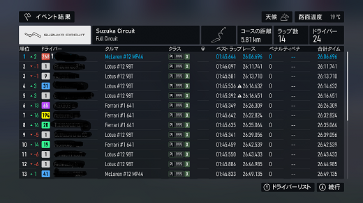 遅くなりました。無課金プレイは終了し、所持装備枠の問題から港を拡張してしまいました。(現在は計36000円使って最大艦船470に拡張しました)提督レベルは120です。リニューアル後のMAPは一通りクリアし、7-5までクリア。昨日も最低限のプレイのみ、艦これは特に書くこと無いわ。シングルシート3シリーズ開始、90年代F-1(全4戦)で、4戦目は鈴鹿フル14周、(透過モード:オン トランスミッション:AT TCS:オン ABS:オン ドライバーレベル:4)ミディアムタイヤ→ハードタイヤ→ミディアムタイヤでクリア。希望的にはミディアムタイヤで5周持ってほしかったんだが、4周が限界なのでハードに替えたがこれも6周が限界だったので、最後はミディアムタイヤにできた。ただ、変にブレーキが効かず、推奨ラインもおかしかったんだが、それが原因かはわからないけど、最終コーナーでイン壁にぶつかってスピンしてるドライアバターが10台くらい居たわ。次は70年代F-1になるんだが、PIがばらけてるので、車選択後にチューンして反映させることが可能。フェラーリが最強だけど、加速がとがりすぎてるので、いじったルノーで挑戦してみるわ。(ダメそうならフェラーリにチェンジするけどw) 現在の主要艦船戦艦長門改二(99)陸奥改二(99)金剛改二丙(99)榛名改二乙(99)比叡改二丙(99)霧島改二丙(99)武蔵改二(99)大和改二(99)ビスマルクdrei(99)イタリア(99)ローマ改(99)Iowa改(99)Warspite改(99)ガングート改二(99)RichelieuDeux(99)Nelson改(99)Cororado改(99)Shuth Dakota改(99)Washington改(99)Conte di Cavour nuovo(99)Maryland改(99)Massachusetts改(99)Jean Bart改(99)Nevada改mod2(99)Rodney改(99)Valiant改(99)航空戦艦扶桑改二(99)山城改二(99)伊勢改二(99)日向改二(99)正規空母赤城改二(99)加賀改二(99)蒼龍改二(99)飛龍改二(99)瑞鶴改二甲(99)翔鶴改二甲(99)大鳳改(99)雲龍改(99)天城改(99)葛城改(99)SaratogaMkII Mod2(99)Aquila改(99)Ark Royal改(99)Intrepid改(99)hornet改(99)Graf Zeppelin改(99)Victorious改(99)Ranger改(99)Lexington改(91) 軽空母千歳航改二(99)千代田航改二(99)龍驤改二(99)瑞鳳改二(99)瑞鳳改二乙(99)飛鷹改(99)隼鷹改二(99)鳳翔改二(99)祥鳳改(99)龍鳳改二(99)大鷹改二(99)神鷹改二(99)鈴谷航改二(99)熊野航改二(99)Gambier Bay Mk2(99)雲鷹改二(99)Langley改(99)潜水艦伊8改(99)伊19改(99)伊58改(99)伊168改(99)まるゆ改(99)呂500(99)伊401改(99)伊14改(99)伊13改(99)伊504(99)伊26改(99)伊47改(99)伊400改(99)伊203改(99)伊201改(99)Scamp改(99)Salmon改(99)伊503(99)Drum改(99)伊41改(99)伊36改(99)Wahoo改(50)水上機母艦千歳甲(87)千代田甲(87)瑞穂改(97)日進甲(99)神威改(90)CommandantTeste(96)三隈改二特(99)航空巡洋艦最上改二特(99)三隈改二(96)鈴谷改二(99)熊野改二(99)利根改二(99)筑摩改二(99)Gotland改二(99)能代改二(99)矢矧改二丙(99)他の”改二”艦船妙高改二(99)那智改二(99)足柄改二(99)羽黒改二(99)衣笠改二(99)摩耶改二(99)鳥海改二(99)古鷹改二(99)加古改二(99)Zara due(99)北上改二(99)大井改二(99)木曽改二(98)夕張改二特(99)五十鈴改二(99)那珂改二(96)神通改二(96)川内改二(97)阿武隈改二(99)鬼怒改二(99)由良改二(99)多摩改二(97)天龍改二(99)龍田改二(98)球磨改二(95)睦月改二(94)如月改二(94)皐月改二(94)文月改二(94)吹雪改二(95)白雪改二(94)初雪改二(94)綾波改二(94)敷波改二(95)浦波改二(94)磯波改二(94)深雪改二(94)叢雲改二(94)初霜改二(94)暁改二(93)夕立改二(98)時雨改三(98)春雨改二(93)江風改二(94)海風改二(94)初春改二(93)荒潮改二(94)大潮改二(94)満潮改二(94)潮改二(98)曙改二(93)霞改二乙(98)霰改二(98)朝潮改二丁(94)天霧改二丁(98)長波改二(97)朝霜改二(94)早霜改二(94)村雨改二(93)陽炎改二(94)不知火改二(94)黒潮改二(94)親潮改二(94)早潮改二(93)天津風改二(94)白露改二(94)秋雲改二(93)夕雲改二(93)巻雲改二(93)風雲改二(95)沖波改二(93)高波改二(93)藤波改二(94)浜波改二(93)清霜改二丁(95)山風改二丁(93)雪風改二(99)初月改二(98)ヴエールヌイ(96)Z1zwei(93)Z3zwei(93)フレッチャーMk2(99)サミュエル・B・ロバーツMk2(98)稲木改二(94)轟沈(3名)陽炎改(21) 4-1ボス戦(囮用)伊168(19) 2-3ボス戦皐月改二(82) 2-2ボス戦未入手艦船一覧戦艦コンプリート!空母コンプリート!重巡洋艦コンプリート!軽巡洋艦コンプリート!駆逐艦夏雲潜水艦コンプリート!海防艦コンプリート!その他コンプリート!