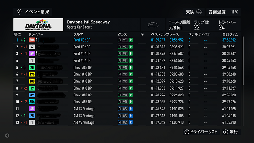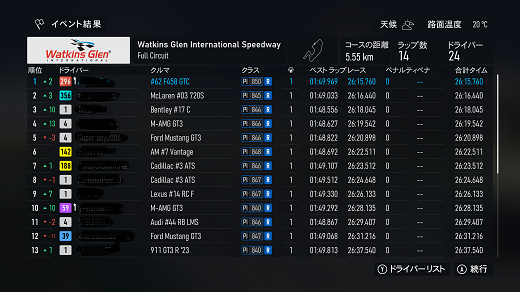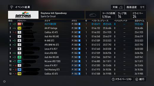 無課金プレイは終了し、所持装備枠の問題から港を拡張してしまいました。(現在は計36000円使って最大艦船470に拡張しました)提督レベルは120です。リニューアル後のMAPは一通りクリアし、7-5までクリア。艦これは最低限プレイのみ、今日はメンテ日なんで演習だけさっさと終わらせたわ。箱コンソールプレイの新FMの話、耐久ツアーシリーズ(全6シリーズ)、2シリーズ目グローバルGTE(全3戦)タイヤ消耗x4、グローバルGTE(全3戦)で、3戦目はブランドハッチフル17周、(透過モード:オン トランスミッション:AT TCS:オン ABS:オン ドライバーレベル:4)結論を言うと、ウエットタイヤ→7周目ウエットタイヤ→8周目ハードタイヤで1位wウエットタイヤで8周走りたかったんだが、7周目が限界で雨が止みそうになかったので、ウエットタイヤを履いたら8周目で空が晴れてるw1周でウエットを捨ててハードタイヤで挽回開始。ドライアバターは終わったウエットタイヤで8周目を走ってたので、かなり順位を挽回してたので1位に届いた感じ。7周目の段階でハードタイヤに交換してたとしたら、最終周のタイヤ消耗は厳しかったので、逆転された可能性はあるかもしれない。結果論でいうならウエットタイヤ4周→ウエットタイヤ4周→ハードタイヤがベストだった気がするわ。次のシリーズはデイトナプロトタイプで候補の車は2台のみ。デイトナサーキットで22周もあるので、2ピットになりそうだがタイヤ戦略がまったく読めないわ。別件話、「ウマ娘」の話、1日2育成で、何とかイベントポイント150に到達。これで今日から1日1育成に戻れるわ。あと無料サポカ10連の方はSRx3出るも新規も凸も無し、チケットが貯まった10連で新規RとSR凸が出たのでチャラか? 現在の主要艦船戦艦長門改二(99)陸奥改二(99)金剛改二丙(99)榛名改二乙(99)比叡改二丙(99)霧島改二丙(99)武蔵改二(99)大和改二(99)ビスマルクdrei(99)イタリア(99)ローマ改(99)Iowa改(99)Warspite改(99)ガングート改二(99)RichelieuDeux(99)Nelson改(99)Cororado改(99)Shuth Dakota改(99)Washington改(99)Conte di Cavour nuovo(99)Maryland改(99)Massachusetts改(99)Jean Bart改(99)Nevada改mod2(99)Rodney改(99)Valiant改(99)航空戦艦扶桑改二(99)山城改二(99)伊勢改二(99)日向改二(99)正規空母赤城改二(99)加賀改二(99)蒼龍改二(99)飛龍改二(99)瑞鶴改二甲(99)翔鶴改二甲(99)大鳳改(99)雲龍改(99)天城改(99)葛城改(99)SaratogaMkII Mod2(99)Aquila改(99)Ark Royal改(99)Intrepid改(99)hornet改(99)Graf Zeppelin改(99)Victorious改(99)Ranger改(99)Lexington改(91) 軽空母千歳航改二(99)千代田航改二(99)龍驤改二(99)瑞鳳改二(99)瑞鳳改二乙(99)飛鷹改(99)隼鷹改二(99)鳳翔改二(99)祥鳳改(99)龍鳳改二(99)大鷹改二(99)神鷹改二(99)鈴谷航改二(99)熊野航改二(99)Gambier Bay Mk2(99)雲鷹改二(99)Langley改(99)潜水艦伊8改(99)伊19改(99)伊58改(99)伊168改(99)まるゆ改(99)呂500(99)伊401改(99)伊14改(99)伊13改(99)伊504(99)伊26改(99)伊47改(99)伊400改(99)伊203改(99)伊201改(99)Scamp改(99)Salmon改(99)伊503(99)Drum改(99)伊41改(99)伊36改(99)Wahoo改(50)水上機母艦千歳甲(87)千代田甲(87)瑞穂改(97)日進甲(99)神威改(90)CommandantTeste(96)三隈改二特(99)航空巡洋艦最上改二特(99)三隈改二(96)鈴谷改二(99)熊野改二(99)利根改二(99)筑摩改二(99)Gotland改二(99)能代改二(99)矢矧改二丙(99)他の”改二”艦船妙高改二(99)那智改二(99)足柄改二(99)羽黒改二(99)衣笠改二(99)摩耶改二(99)鳥海改二(99)古鷹改二(99)加古改二(99)Zara due(99)北上改二(99)大井改二(99)木曽改二(98)夕張改二特(99)五十鈴改二(99)那珂改二(96)神通改二(96)川内改二(97)阿武隈改二(99)鬼怒改二(99)由良改二(99)多摩改二(97)天龍改二(99)龍田改二(98)球磨改二(95)睦月改二(94)如月改二(94)皐月改二(94)文月改二(94)吹雪改二(95)白雪改二(94)初雪改二(94)綾波改二(94)敷波改二(95)浦波改二(94)磯波改二(94)深雪改二(94)叢雲改二(94)初霜改二(94)暁改二(93)夕立改二(98)時雨改三(98)春雨改二(93)江風改二(94)海風改二(94)初春改二(93)荒潮改二(94)大潮改二(94)満潮改二(94)潮改二(98)曙改二(93)霞改二乙(98)霰改二(98)朝潮改二丁(94)天霧改二丁(98)長波改二(97)朝霜改二(94)早霜改二(94)村雨改二(93)陽炎改二(94)不知火改二(94)黒潮改二(94)親潮改二(94)早潮改二(93)天津風改二(94)白露改二(94)秋雲改二(93)夕雲改二(93)巻雲改二(93)風雲改二(95)沖波改二(93)高波改二(93)藤波改二(94)浜波改二(93)清霜改二丁(95)山風改二丁(93)雪風改二(99)初月改二(98)ヴエールヌイ(96)Z1zwei(93)Z3zwei(93)フレッチャーMk2(99)サミュエル・B・ロバーツMk2(98)稲木改二(94)轟沈(3名)陽炎改(21) 4-1ボス戦(囮用)伊168(19) 2-3ボス戦皐月改二(82) 2-2ボス戦未入手艦船一覧戦艦コンプリート!空母コンプリート!重巡洋艦コンプリート!軽巡洋艦コンプリート!駆逐艦夏雲潜水艦コンプリート!海防艦コンプリート!その他コンプリート!