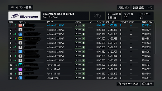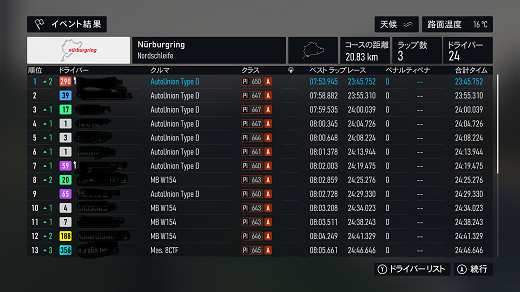 無課金プレイは終了し、所持装備枠の問題から港を拡張してしまいました。(現在は計36000円使って最大艦船470に拡張しました)提督レベルは120です。リニューアル後のMAPは一通りクリアし、7-5までクリア。昨日も最低限のプレイのみ、艦これは特に書くこと無いわ。シングルシート3シリーズ開始、90年代F-1(全4戦)で、シルバーストーンフル14周から。(透過モード:オン トランスミッション:AT TCS:オン ABS:オン ドライバーレベル:4)このシリーズもタイヤ消耗x6ハードで頑張れば7周1ピットはできるが、タイヤ消耗中までいくので、透過モードの直線番長仕様じゃなかったら1位キープできなかったと思う。タイヤは不明だが、7周ワンピット勢が多かったので、2ピットはきついんじゃないかな。(ミディアムで5周走れるか怪しいんだよなぁ)次はホッケンハイムフル16周だけど、ここはほんとATは辛いんだよなぁ、セッティングも含め悩ましいわ。別件話、「DOAXVV」の話、アトリエコラボ後編とぴょんぴょんの2つのイベントが開始。いつもの30連+トレンドチケットx10でぴょんぴょんのイベSSR水着はゲット!(ぴょんぴょんの水着なのでアトリエでの特効無し、アトリエの方は前半からの水着の特効のみ)ただ、レベル80強化のイベ水着1着ではぴょんぴょんのSSSに勝てなかったわ。「ウマ娘」の話、イベポイント150万に到達、ただし、称号の方はあと4回育成しないと貰えないわ。 現在の主要艦船戦艦長門改二(99)陸奥改二(99)金剛改二丙(99)榛名改二乙(99)比叡改二丙(99)霧島改二丙(99)武蔵改二(99)大和改二(99)ビスマルクdrei(99)イタリア(99)ローマ改(99)Iowa改(99)Warspite改(99)ガングート改二(99)RichelieuDeux(99)Nelson改(99)Cororado改(99)Shuth Dakota改(99)Washington改(99)Conte di Cavour nuovo(99)Maryland改(99)Massachusetts改(99)Jean Bart改(99)Nevada改mod2(99)Rodney改(99)Valiant改(99)航空戦艦扶桑改二(99)山城改二(99)伊勢改二(99)日向改二(99)正規空母赤城改二(99)加賀改二(99)蒼龍改二(99)飛龍改二(99)瑞鶴改二甲(99)翔鶴改二甲(99)大鳳改(99)雲龍改(99)天城改(99)葛城改(99)SaratogaMkII Mod2(99)Aquila改(99)Ark Royal改(99)Intrepid改(99)hornet改(99)Graf Zeppelin改(99)Victorious改(99)Ranger改(99)Lexington改(91) 軽空母千歳航改二(99)千代田航改二(99)龍驤改二(99)瑞鳳改二(99)瑞鳳改二乙(99)飛鷹改(99)隼鷹改二(99)鳳翔改二(99)祥鳳改(99)龍鳳改二(99)大鷹改二(99)神鷹改二(99)鈴谷航改二(99)熊野航改二(99)Gambier Bay Mk2(99)雲鷹改二(99)Langley改(99)潜水艦伊8改(99)伊19改(99)伊58改(99)伊168改(99)まるゆ改(99)呂500(99)伊401改(99)伊14改(99)伊13改(99)伊504(99)伊26改(99)伊47改(99)伊400改(99)伊203改(99)伊201改(99)Scamp改(99)Salmon改(99)伊503(99)Drum改(99)伊41改(99)伊36改(99)Wahoo改(50)水上機母艦千歳甲(87)千代田甲(87)瑞穂改(97)日進甲(99)神威改(90)CommandantTeste(96)三隈改二特(99)航空巡洋艦最上改二特(99)三隈改二(96)鈴谷改二(99)熊野改二(99)利根改二(99)筑摩改二(99)Gotland改二(99)能代改二(99)矢矧改二丙(99)他の”改二”艦船妙高改二(99)那智改二(99)足柄改二(99)羽黒改二(99)衣笠改二(99)摩耶改二(99)鳥海改二(99)古鷹改二(99)加古改二(99)Zara due(99)北上改二(99)大井改二(99)木曽改二(98)夕張改二特(99)五十鈴改二(99)那珂改二(96)神通改二(96)川内改二(97)阿武隈改二(99)鬼怒改二(99)由良改二(99)多摩改二(97)天龍改二(99)龍田改二(98)球磨改二(95)睦月改二(94)如月改二(94)皐月改二(94)文月改二(94)吹雪改二(95)白雪改二(94)初雪改二(94)綾波改二(94)敷波改二(95)浦波改二(94)磯波改二(94)深雪改二(94)叢雲改二(94)初霜改二(94)暁改二(93)夕立改二(98)時雨改三(98)春雨改二(93)江風改二(94)海風改二(94)初春改二(93)荒潮改二(94)大潮改二(94)満潮改二(94)潮改二(98)曙改二(93)霞改二乙(98)霰改二(98)朝潮改二丁(94)天霧改二丁(98)長波改二(97)朝霜改二(94)早霜改二(94)村雨改二(93)陽炎改二(94)不知火改二(94)黒潮改二(94)親潮改二(94)早潮改二(93)天津風改二(94)白露改二(94)秋雲改二(93)夕雲改二(93)巻雲改二(93)風雲改二(95)沖波改二(93)高波改二(93)藤波改二(94)浜波改二(93)清霜改二丁(95)山風改二丁(93)雪風改二(99)初月改二(98)ヴエールヌイ(96)Z1zwei(93)Z3zwei(93)フレッチャーMk2(99)サミュエル・B・ロバーツMk2(98)稲木改二(94)轟沈(3名)陽炎改(21) 4-1ボス戦(囮用)伊168(19) 2-3ボス戦皐月改二(82) 2-2ボス戦未入手艦船一覧戦艦コンプリート!空母コンプリート!重巡洋艦コンプリート!軽巡洋艦コンプリート!駆逐艦夏雲潜水艦コンプリート!海防艦コンプリート!その他コンプリート!