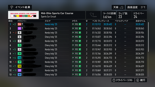 無課金プレイは終了し、所持装備枠の問題から港を拡張してしまいました。(現在は計36000円使って最大艦船470に拡張しました)提督レベルは120です。リニューアル後のMAPは一通りクリアし、7-5までクリア。昨日も最低限のプレイのみ、艦これは特に書くこと無いわ。箱コンソールプレイの新FMの話、サンダーツアーのインディカーシリーズ5戦目ロードアメリカ15周、(トランスミッション:AT TCS:ON ABS:ON ドライアバターの強さ:4 透過モード:ON)ミディアムタイヤで5周x3やって17位(同じピットタイミンググループで第二集団グループ内で0.1秒以内差の2位)だった。(感じからすると6周が派手なタイム落ちしない限界かな)10周目の段階で1位に上がったので、ソフト3~5周x2、ミディアムタイヤ6~7周x1が15台もいたのか?(しかもトータルタイムで10秒も負けてるし)ピット回数は全員2回で、ピットタイムが13秒ほどというのもあるんだろうけど、1周目に恐ろしく速く走るので、そこでファステストで5秒も差がつくの?(なぞの2台以外はファステスト2秒差以内なんだよなぁ、わからん)あと3戦残して総合2位とのポイント差は12点まで減ってしまった。6戦目はミッドオハイオだが、低速コーナーはATは不利なんだよなぁ、ABSで減速性能の問題あるし。まあ、最後まで行って招待されるのが総合1位のみとかだと、またインディカーシリーズ全8戦をドライアバター難易度を下げて頭からだからなぁ、投げそうだわw(ただ、1周目がどの難易度でも鬼速いので難易度を最低に下げても1位獲れるか怪しいんだよなぁ、ソロシリーズは)別件話、「ウマ娘」の話、新ガチャは予定通り無償石で10連、イクノディクタスx1とツルマツツヨシx1なら上出来だろう。これでイクノディクタスの才能開花が☆5になったわ。サポカチケも10枚あったので引いてみたが、虹に期待するも、スタミナのメジロパーマーで1凸になったわ。今日の昼にチケットを交換で入手できるけど、☆3確定以外は10連分に届かないので、運試しできるのは上のとSR以上確定x2の3つだけだなぁ。 現在の主要艦船戦艦長門改二(99)陸奥改二(99)金剛改二丙(99)榛名改二乙(99)比叡改二丙(99)霧島改二丙(99)武蔵改二(99)大和改二(99)ビスマルクdrei(99)イタリア(99)ローマ改(99)Iowa改(99)Warspite改(99)ガングート改二(99)RichelieuDeux(99)Nelson改(99)Cororado改(99)Shuth Dakota改(99)Washington改(99)Conte di Cavour nuovo(99)Maryland改(99)Massachusetts改(99)Jean Bart改(99)Nevada改mod2(99)Rodney改(99)Valiant改(99)航空戦艦扶桑改二(99)山城改二(99)伊勢改二(99)日向改二(99)正規空母赤城改二(99)加賀改二(99)蒼龍改二(99)飛龍改二(99)瑞鶴改二甲(99)翔鶴改二甲(99)大鳳改(99)雲龍改(99)天城改(99)葛城改(99)SaratogaMkII Mod2(99)Aquila改(99)Ark Royal改(99)Intrepid改(99)hornet改(99)Graf Zeppelin改(99)Victorious改(99)Ranger改(99)Lexington改(91) 軽空母千歳航改二(99)千代田航改二(99)龍驤改二(99)瑞鳳改二(99)瑞鳳改二乙(99)飛鷹改(99)隼鷹改二(99)鳳翔改二(99)祥鳳改(99)龍鳳改二(99)大鷹改二(99)神鷹改二(99)鈴谷航改二(99)熊野航改二(99)Gambier Bay Mk2(99)雲鷹改二(99)Langley改(99)潜水艦伊8改(99)伊19改(99)伊58改(99)伊168改(99)まるゆ改(99)呂500(99)伊401改(99)伊14改(99)伊13改(99)伊504(99)伊26改(99)伊47改(99)伊400改(99)伊203改(99)伊201改(99)Scamp改(99)Salmon改(99)伊503(99)Drum改(99)伊41改(99)伊36改(99)Wahoo改(50)水上機母艦千歳甲(87)千代田甲(87)瑞穂改(97)日進甲(99)神威改(90)CommandantTeste(96)三隈改二特(99)航空巡洋艦最上改二特(99)三隈改二(96)鈴谷改二(99)熊野改二(99)利根改二(99)筑摩改二(99)Gotland改二(99)能代改二(99)矢矧改二丙(99)他の”改二”艦船妙高改二(99)那智改二(99)足柄改二(99)羽黒改二(99)衣笠改二(99)摩耶改二(99)鳥海改二(99)古鷹改二(99)加古改二(99)Zara due(99)北上改二(99)大井改二(99)木曽改二(98)夕張改二特(99)五十鈴改二(99)那珂改二(96)神通改二(96)川内改二(97)阿武隈改二(99)鬼怒改二(99)由良改二(99)多摩改二(97)天龍改二(99)龍田改二(98)球磨改二(95)睦月改二(94)如月改二(94)皐月改二(94)文月改二(94)吹雪改二(95)白雪改二(94)初雪改二(94)綾波改二(94)敷波改二(95)浦波改二(94)磯波改二(94)深雪改二(94)叢雲改二(94)初霜改二(94)暁改二(93)夕立改二(98)時雨改三(98)春雨改二(93)江風改二(94)海風改二(94)初春改二(93)荒潮改二(94)大潮改二(94)満潮改二(94)潮改二(98)曙改二(93)霞改二乙(98)霰改二(98)朝潮改二丁(94)天霧改二丁(98)長波改二(97)朝霜改二(94)早霜改二(94)村雨改二(93)陽炎改二(94)不知火改二(94)黒潮改二(94)親潮改二(94)早潮改二(93)天津風改二(94)白露改二(94)秋雲改二(93)夕雲改二(93)巻雲改二(93)風雲改二(95)沖波改二(93)高波改二(93)藤波改二(94)浜波改二(93)清霜改二丁(95)山風改二丁(93)雪風改二(99)初月改二(98)ヴエールヌイ(96)Z1zwei(93)Z3zwei(93)フレッチャーMk2(99)サミュエル・B・ロバーツMk2(98)稲木改二(94)轟沈(3名)陽炎改(21) 4-1ボス戦(囮用)伊168(19) 2-3ボス戦皐月改二(82) 2-2ボス戦未入手艦船一覧戦艦コンプリート!空母コンプリート!重巡洋艦コンプリート!軽巡洋艦コンプリート!駆逐艦夏雲潜水艦コンプリート!海防艦コンプリート!その他コンプリート!