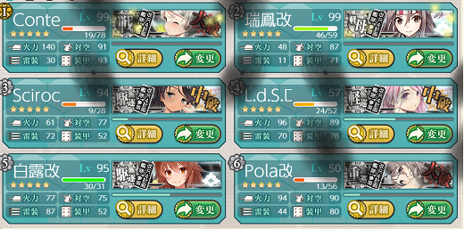 遅くなりました。 無課金プレイは終了し、所持装備枠の問題から港を拡張してしまいました。(現在は計38000円使って最大艦船490に拡張しました)提督レベルは120です。リニューアル後のMAPは一通りクリアし、7-5までクリア。期間限定海域は乙乙で出撃中、現在の秋刀魚の確保数は14尾まずは秋刀魚演習任務からクリアし、報酬は戦闘糧食+3を選択。(次は20尾確保報酬かぁ)その後は、最低限のプレイ後に、Sマスのボスマス出現ギミックから。うっかりと高速統一で行って第一ボスに向かってしまったわ。現状、E-3は丙で行く可能性が高いので、サブのウオースパイトを低速艦として投入した。(空襲マスには行ったけど無事Eに進んだ)Sマスの集積地が4200もあり、WG42x2の対地装備では全くダメージが出ずA勝利でおわったが、戦艦の徹甲弾でそれ以外はワンパンでA勝利となったが、乙はA勝利x1でボスマス出現して助かった。E2-3だが、道中はE2-2とラストまでは同じらしい。とにかく新艦3隻が固くダメージが通らない上、射程が長いのか先制でワンパンしてくる。ネルソンタッチも特効重巡洋艦では火力不足であまりダメージが出ないし、陣形のせいか支援の効果も第二艦隊のダメージも落ちる。E2-2は防空が高く基地航空隊が送れなかったが、削り段階では防空能力が低いので、基地航空隊がかなり有効なのが盲点だった。第四にすれば基地航空隊も砲撃支援もダメージが上がり特効艦のダメージも増える。ドイツ艦のダメージがかなり出る(これは索敵機特効が大きい?)ので、Z1とZ3を投入してみたが、基礎値が低すぎて日本の後期型駆逐艦をそのまま使う方が上だったわorz(ボス敵にはダメージが出るのかもしれないが、通常敵に全くダメージが出ず雑魚も倒せないのでとてもじゃないが使えない(大発でも積めると違うんだけど))向こう側に何か運を下げる要素でもあるのか、魚雷カットインの発動が恐ろしく低く、S勝利ができてないんだよなぁ。装甲破砕の条件が艦これWikiに出てないので、何とかラスト突入までやって今日は終わったわ。ちなみに、A勝利しかできてないので、海外艦のドロップは1隻もないわ。 現在の主要艦船戦艦長門改二(99)陸奥改二(99)金剛改二丙(99)榛名改二乙(99)比叡改二丙(99)霧島改二丙(99)武蔵改二(99)大和改二(99)ビスマルクdrei(99)イタリア(99)ローマ改(99)Iowa改(99)Warspite改(99)ガングート改二(99)RichelieuDeux(99)Nelson改(99)Cororado改(99)Shuth Dakota改(99)Washington改(99)Conte di Cavour nuovo(99)Maryland改(99)Massachusetts改(99)Jean Bart改(99)Nevada改mod2(99)Rodney改(99)Valiant改(99)航空戦艦扶桑改二(99)山城改二(99)伊勢改二(99)日向改二(99)正規空母赤城改二(99)加賀改二(99)蒼龍改二(99)飛龍改二(99)瑞鶴改二甲(99)翔鶴改二甲(99)大鳳改(99)雲龍改(99)天城改(99)葛城改(99)SaratogaMkII Mod2(99)Aquila改(99)Ark Royal改(99)Intrepid改(99)hornet改(99)Graf Zeppelin改(99)Victorious改(99)Ranger改(99)Lexington改(96) 軽空母千歳航改二(99)千代田航改二(99)龍驤改二(99)瑞鳳改二(99)瑞鳳改二乙(99)飛鷹改(99)隼鷹改二(99)鳳翔改二(99)祥鳳改(99)龍鳳改二(99)大鷹改二(99)神鷹改二(99)鈴谷航改二(99)熊野航改二(99)Gambier Bay Mk2(99)雲鷹改二(99)Langley改(99)潜水艦伊8改(99)伊19改(99)伊58改(99)伊168改(99)まるゆ改(99)呂500(99)伊401改(99)伊14改(99)伊13改(99)伊504(99)伊26改(99)伊47改(99)伊400改(99)伊203改(99)伊201改(99)Scamp改(99)Salmon改(99)伊503(99)Drum改(99)伊41改(99)伊36改(99)Wahoo改(95)水上機母艦千歳甲(87)千代田甲(87)瑞穂改(97)日進甲(99)神威改(90)CommandantTeste(96)三隈改二特(99)航空巡洋艦最上改二特(99)三隈改二(96)鈴谷改二(99)熊野改二(99)利根改二(99)筑摩改二(99)Gotland改二(99)能代改二(99)矢矧改二丙(99)他の”改二”艦船妙高改二(99)那智改二(99)足柄改二(99)羽黒改二(99)衣笠改二(99)摩耶改二(99)鳥海改二(99)古鷹改二(99)加古改二(99)Zara due(99)北上改二(99)大井改二(99)木曽改二(98)夕張改二特(99)五十鈴改二(99)那珂改二(98)神通改二(98)川内改二(98)阿武隈改二(99)鬼怒改二(99)由良改二(99)多摩改二(97)天龍改二(99)龍田改二(98)球磨改二(95)睦月改二(94)如月改二(94)皐月改二(94)文月改二(94)吹雪改二(95)白雪改二(94)初雪改二(94)綾波改二(94)敷波改二(95)浦波改二(94)磯波改二(94)深雪改二(94)叢雲改二(94)初霜改二(94)暁改二(94)夕立改二(98)時雨改三(98)春雨改二(94)江風改二(94)海風改二(94)初春改二(94)荒潮改二(94)大潮改二(94)満潮改二(94)潮改二(98)曙改二(93)霞改二乙(98)霰改二(98)朝潮改二丁(94)天霧改二丁(98)長波改二(97)朝霜改二(94)早霜改二(94)村雨改二(95)陽炎改二(94)不知火改二(94)黒潮改二(94)親潮改二(94)早潮改二(94)天津風改二(94)白露改二(94)秋雲改二(94)夕雲改二(94)巻雲改二(94)風雲改二(95)沖波改二(94)高波改二(95)藤波改二(95)浜波改二(94)清霜改二丁(95)山風改二丁(93)雪風改二(99)初月改二(98)ヴエールヌイ(96)Z1zwei(93)Z3zwei(93)フレッチャーMk2(99)サミュエル・B・ロバーツMk2(98)稲木改二(95)轟沈(3名)陽炎改(21) 4-1ボス戦(囮用)伊168(19) 2-3ボス戦皐月改二(82) 2-2ボス戦未入手艦船一覧戦艦Glorious 空母Wasp重巡洋艦コンプリート!軽巡洋艦コンプリート!駆逐艦夏雲、樫潜水艦Dace海防艦Eidsvoldその他南海